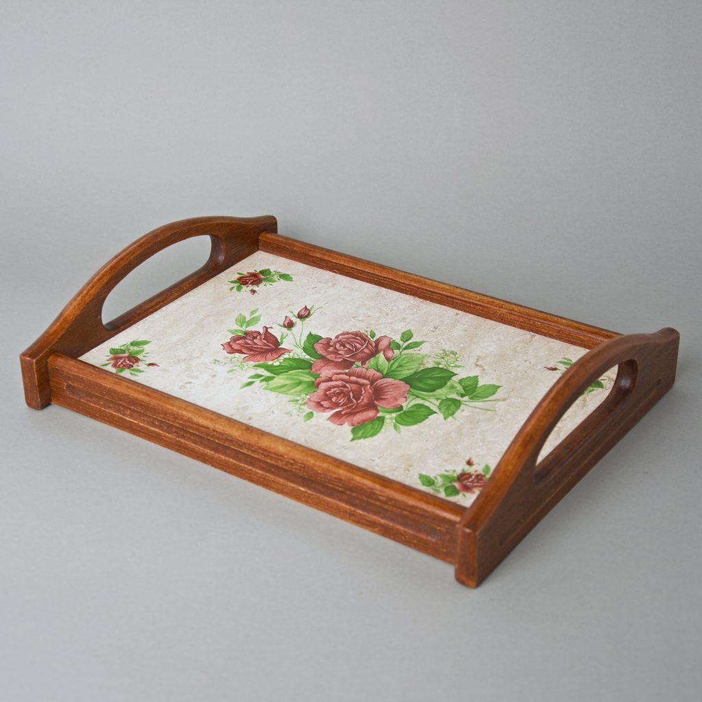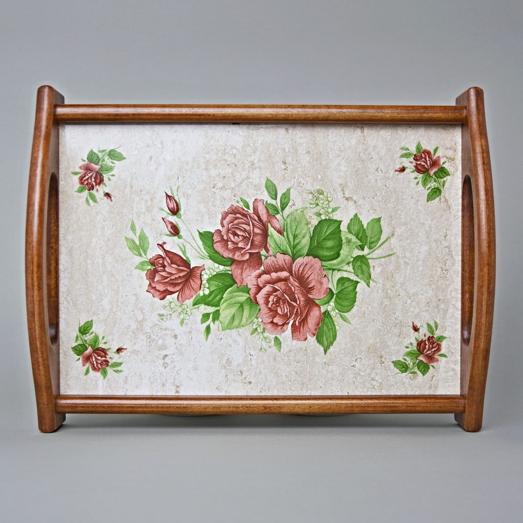 Kuchyňský podnos / destička / prkénko v dřevěném rámu 31 x 24 cm, dekor tmavě červené růže, česká ruční výroba