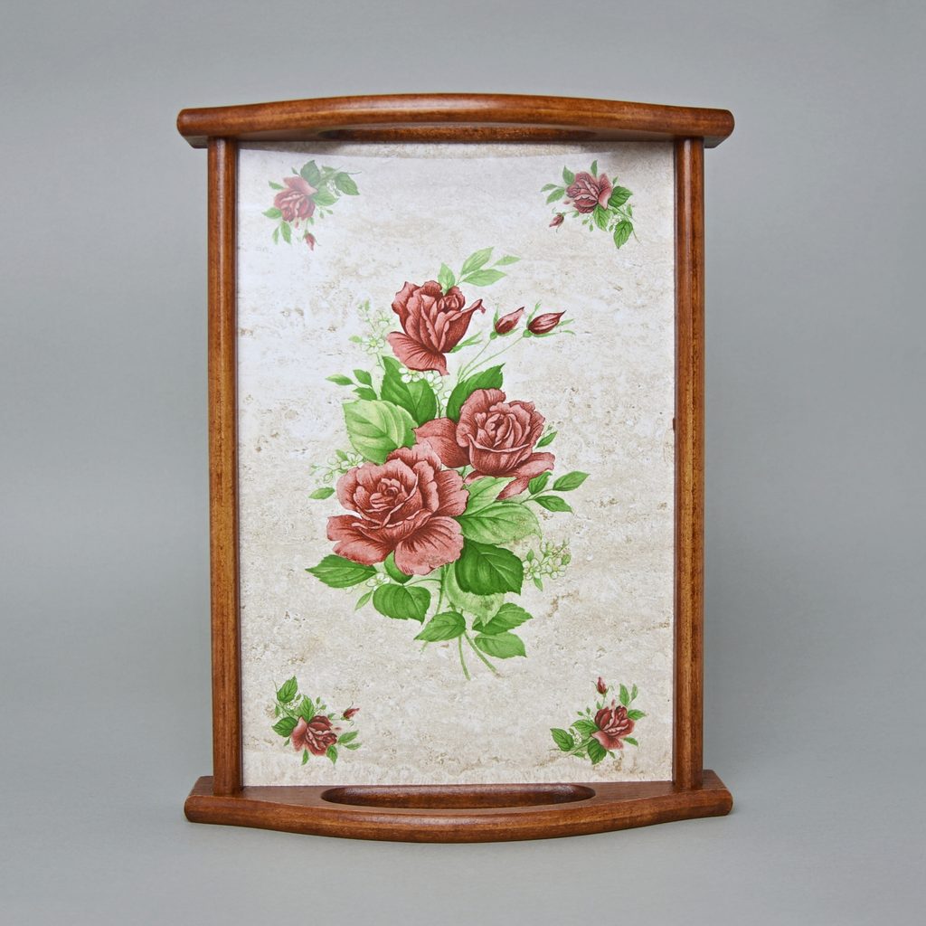 keramická podložka (kachlík) s kvalitně (výpal 850 stupňů) naneseným trvanlivým dekorem (užitná plocha 18,6 x 28,5 cm) zasazená do ručně vyrobeného dřevěného rámu
