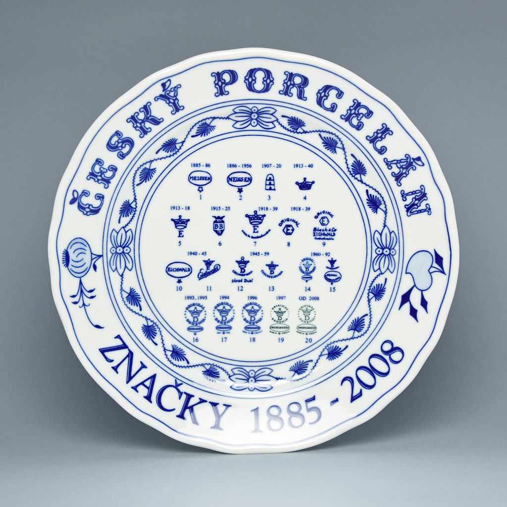 Porcelánový pamětní talíř závěsný se spodními značkami od r. 1885 až 2008. Kvalitní český porcelán z továrny Český porcelán, a.s., Cibulový dekor.