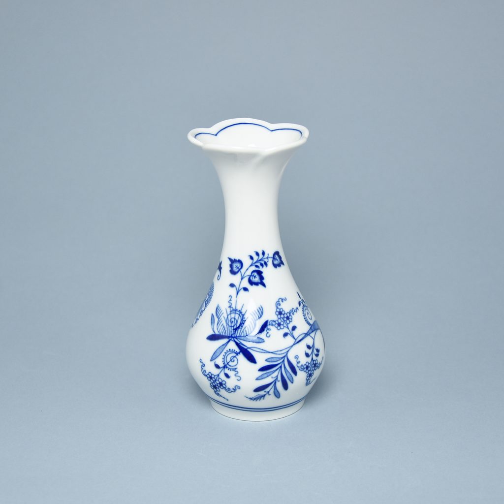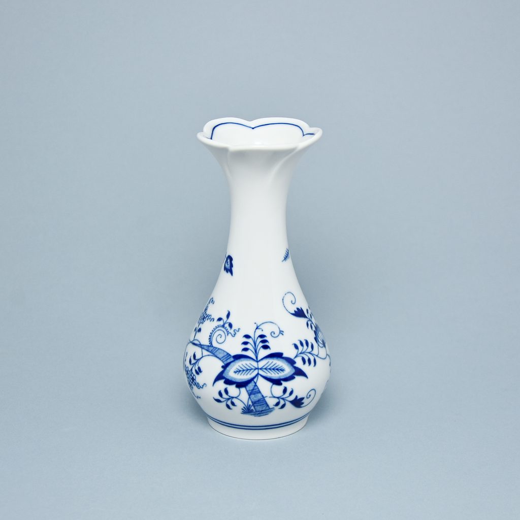 Porcelánová vázička 16,5 cm vysoká s ozdobným okrajem do tvaru květu. Kvalitní český porcelán z továrny Český porcelán, a.s.. Na vázičce tradiční originální dekor modrého cibulového vzoru.