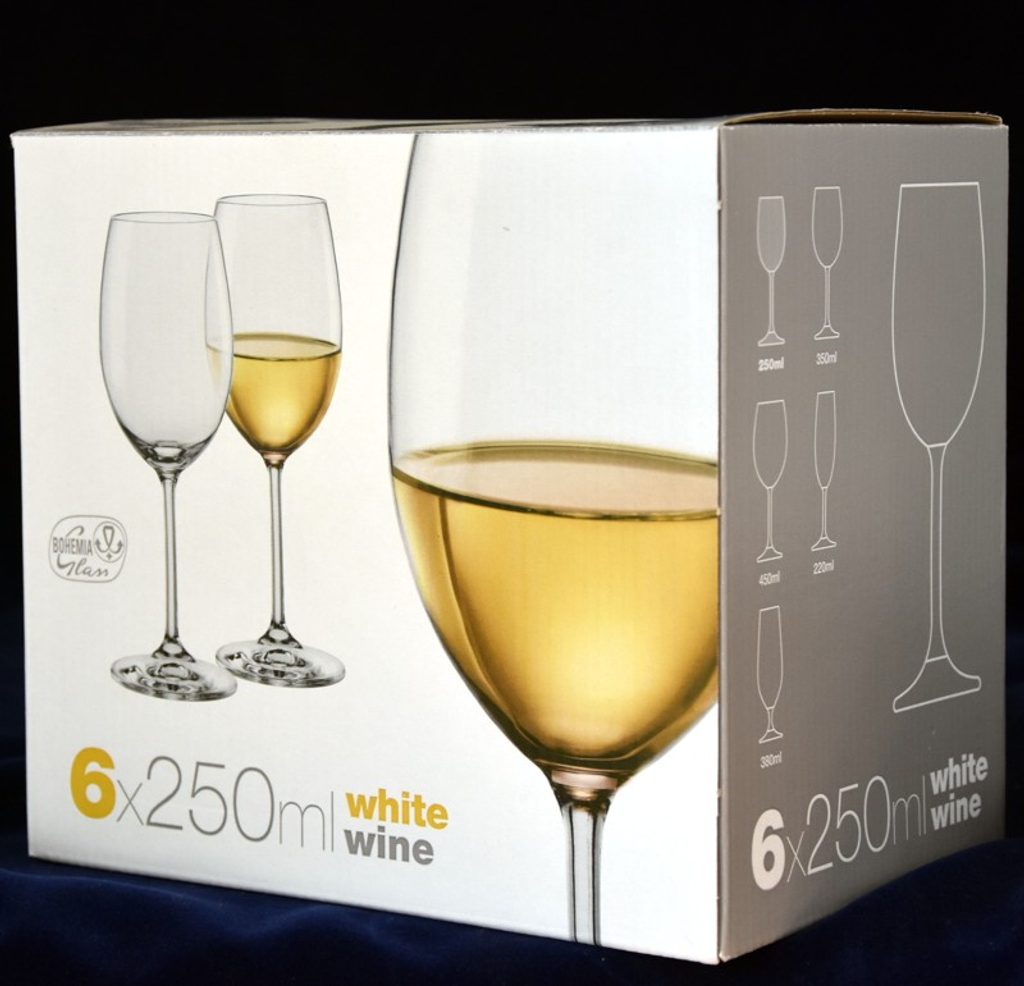 pr. 70 mm, v. 188 mm, kvalitní české užitkové bezolovnaté křišťálové sklo, tvar Lara, na bílé víno