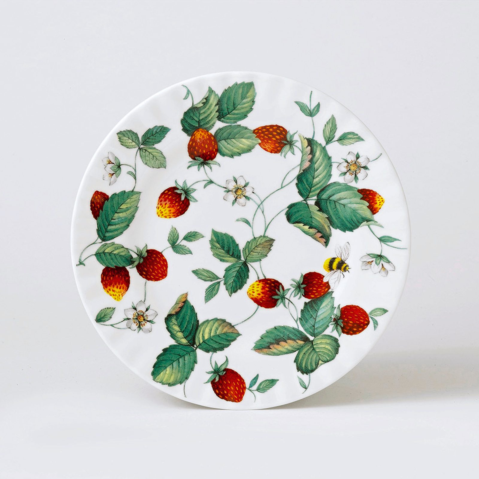 Dezertní talíř tvarr coups zdobený divokou krásou Fragaria vesca (lesní jahoda, tedy jahodník obecný). Design lesních jahod zdobí bílý jemný kostní porcelán. Zářivě červené a tlumené zelené odstíny složitých botanických ilustrací jsou nadekorovány velmi pečlivě.