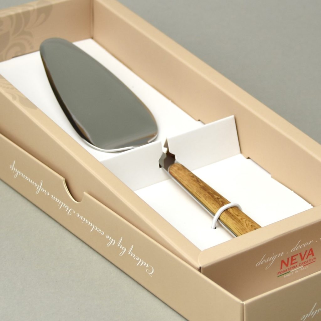 lopatka na dort v dárkové krabičce, řada BISTROT, imitace dřevěné rukojeti, leštěno do vysokého lesku, nerezová ocel 18/10, plastová rukojeť, sublimovaný nesmytelný dekor - Italové - mistrové užitného domácího designu, krásná napodobenina dřevěného dekoru
