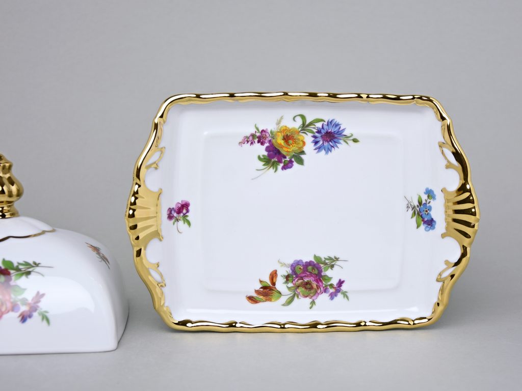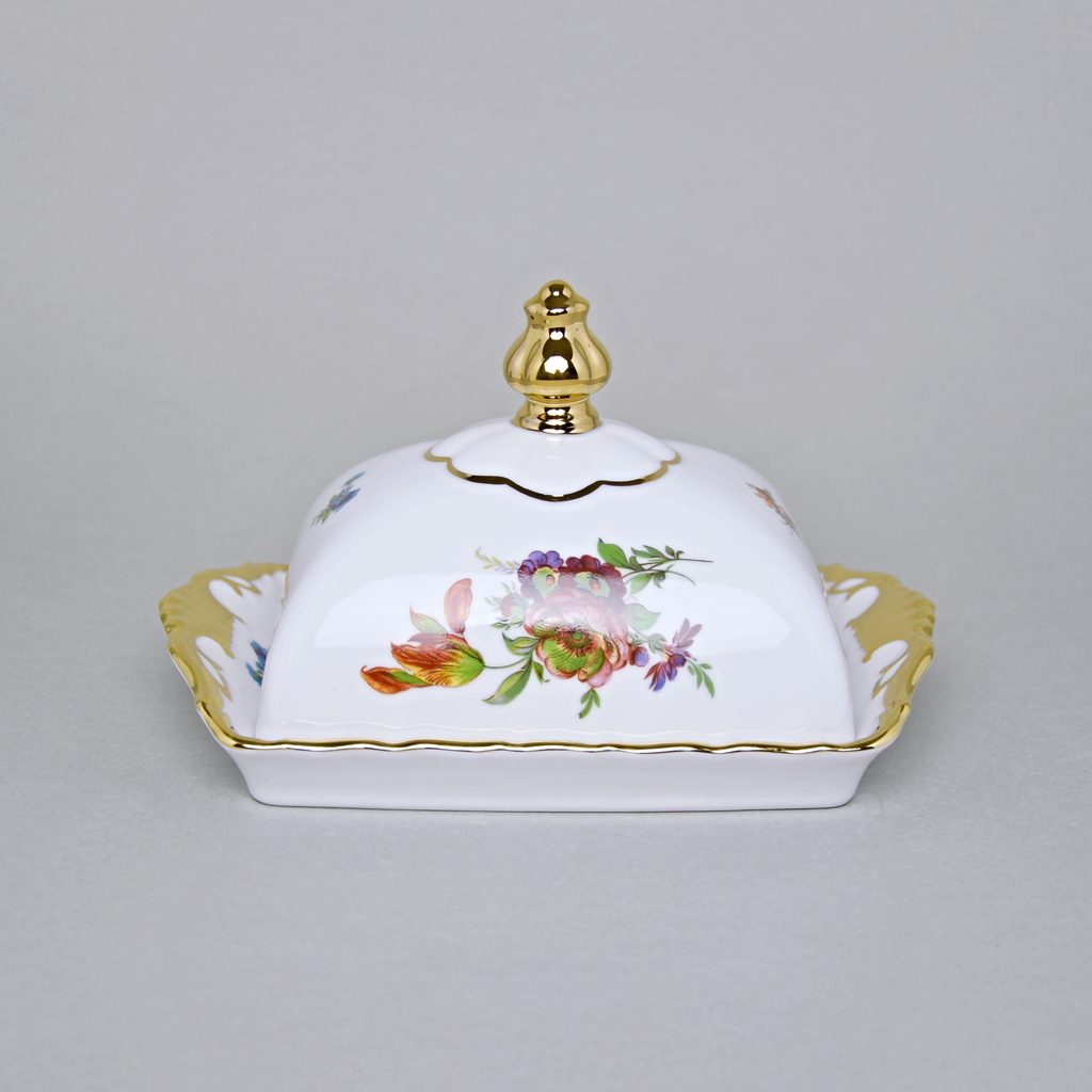 Zdobná máslenka dvoudílná s víkem na klasické 250 g máslo z kolekce Aristokrat - květinový dekor se zlatem. Malá česká porcelánka Queens Crown.