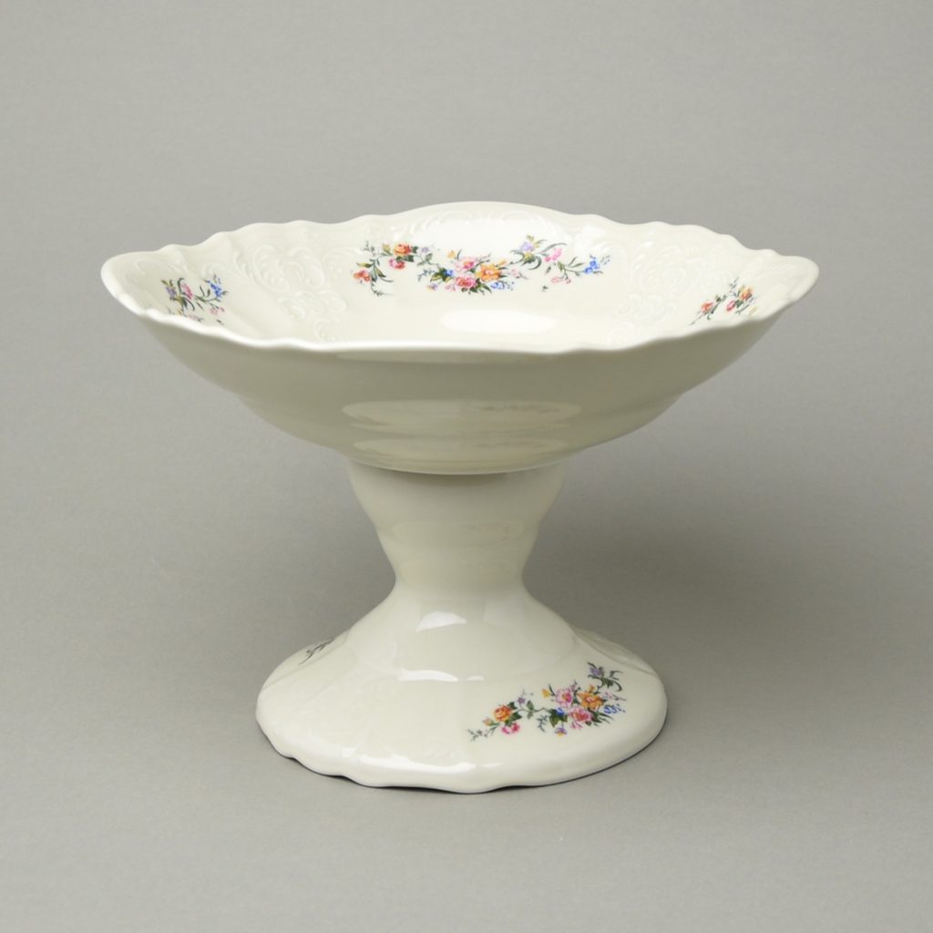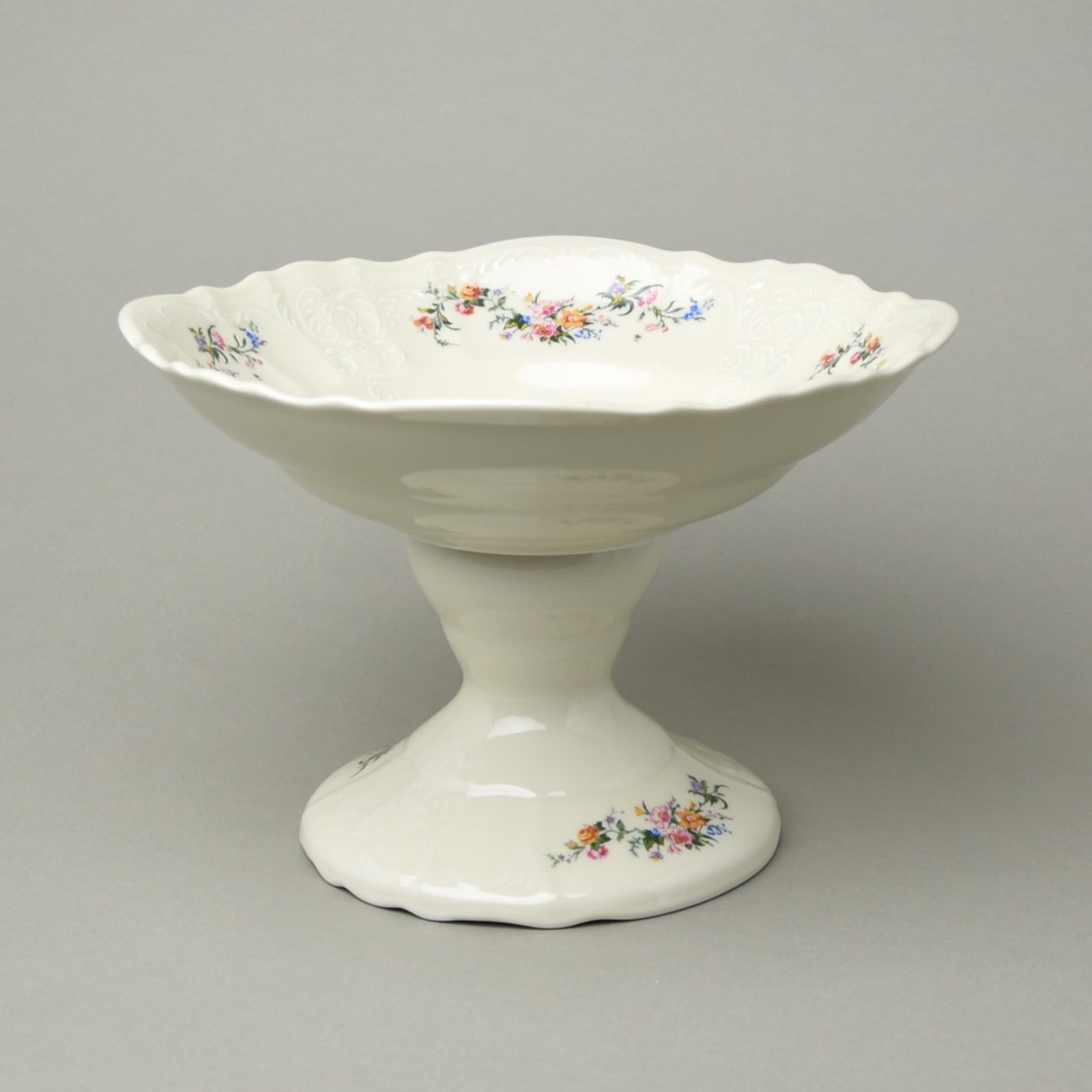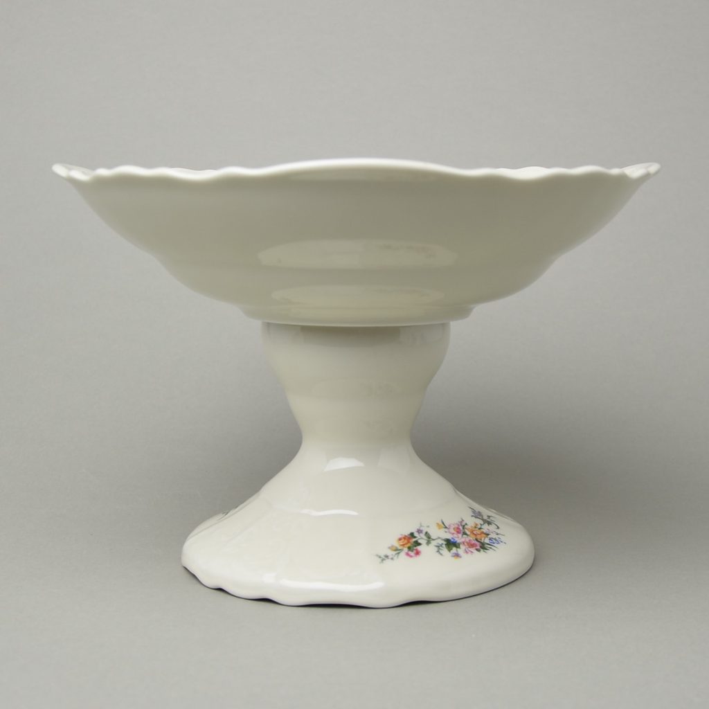 kompotová mísa na noze / odzdoba stolu, na ovoce, cukrovinky, apod., tvar Bernadotte, ivory porcelán (béžový), dekor kytičky d00300, v. 16 cm