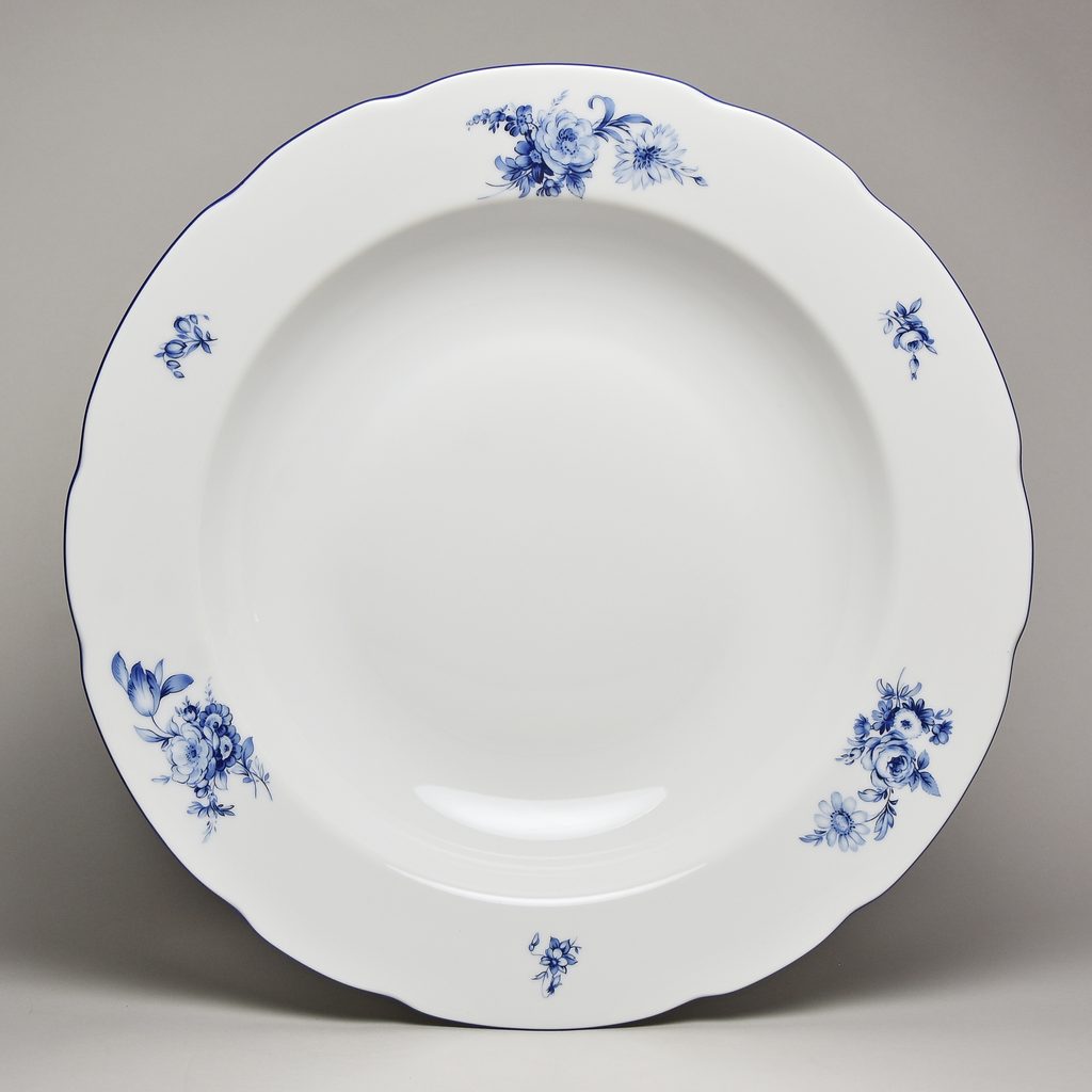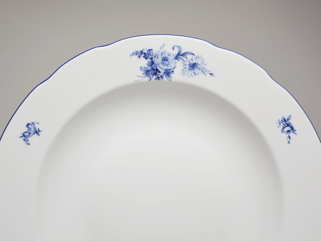 staromodní, ale velmi povedený glazurovaný dekor modrých růží, tvar Rose z porcelánky THUN