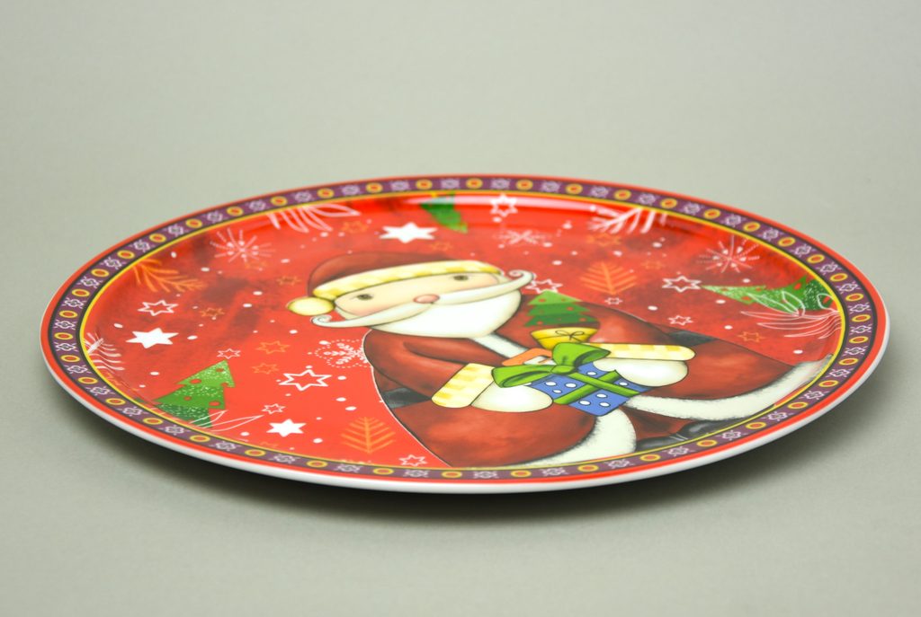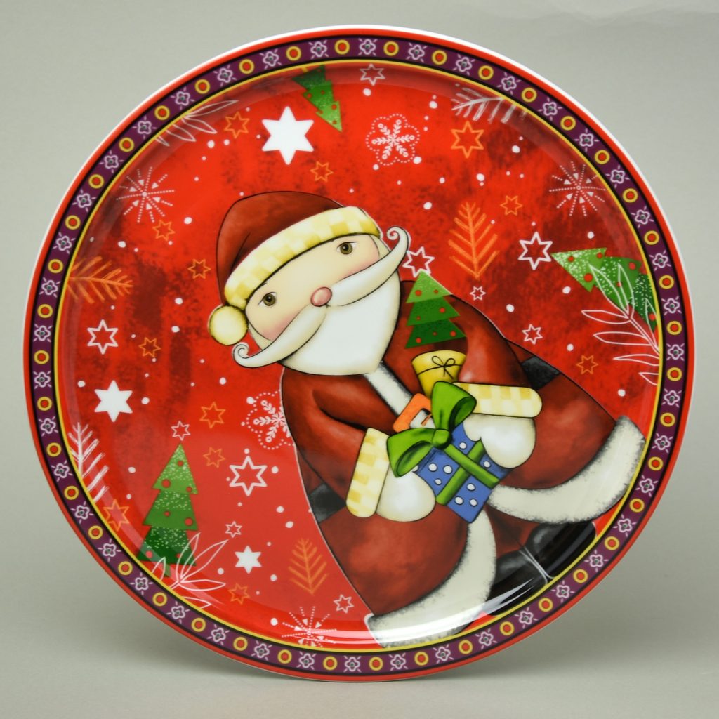 dortový / koláčový talíř / mísa mělká kulatá servírovací s vánočním motivem Santa Claus, krásná dárková krabička