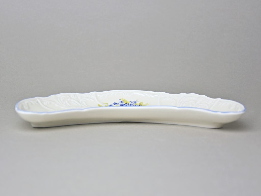 Miska na kosti 22 cm, Bernadotte, dekor Pomněnky v NA PORCELÁNU IVORY - BÉŽOVÉM. Víte, proč mají misky na kosti obvykle tvar půlměsíce? Ne snad, že by s měsícem měly něco společného... ale díky tomuto tvaru Vám miska pasuje krásně okolo horního okraje jídelního talíře, kam ji přiložíte a žádné kosti se při přenášení už nebudou trousit na ubrus! ;-).