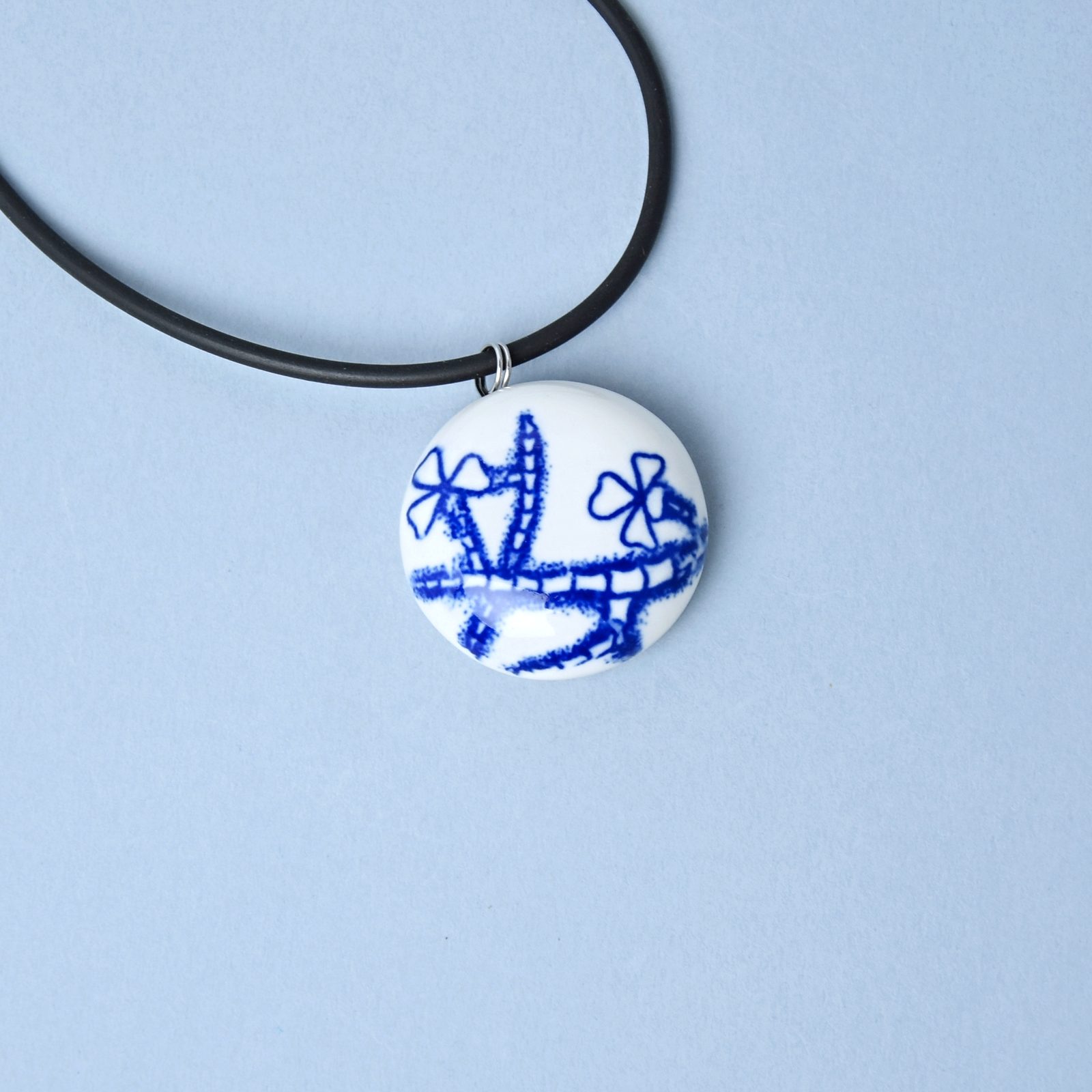 Designový porcelánový náhrdelník - duté lesklé kolečko o průměru 3,8 cm s dekorem kvetoucího kaktusu kobaltovou modří. Velikost 3,8 cm průměr a 1,5 cm hloubka. Tento šperk vkusně doplní a ozvláštní váš outfit. Šperky jsou ručně vyráběné v oblasti čisté přírody Podkrkonoší, kde se nachází ateliér Mallys.