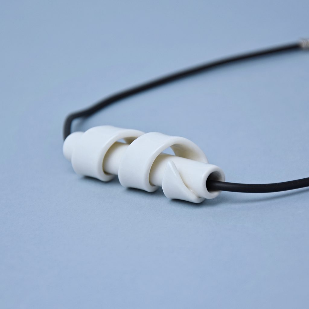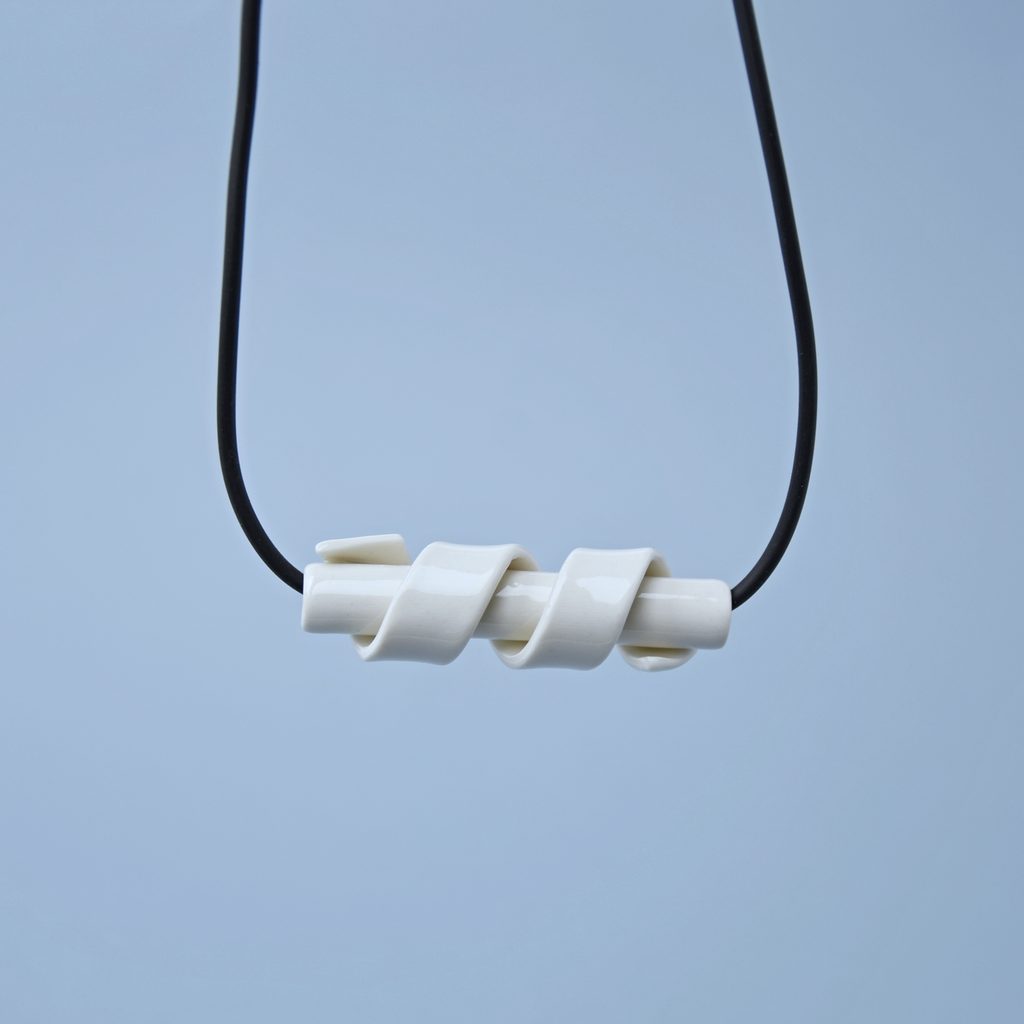 Designový porcelánový náhrdelník který tvoří dutinka dekorovaná spirálou, vinoucí se po jejím obvodu. Tento šperk plný dynamických linií vkusně doplní jakýkoliv váš outfit. Šperky jsou ručně vyráběné v oblasti čisté přírody Podkrkonoší, kde se nachází ateliér Mallys.