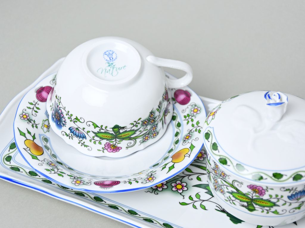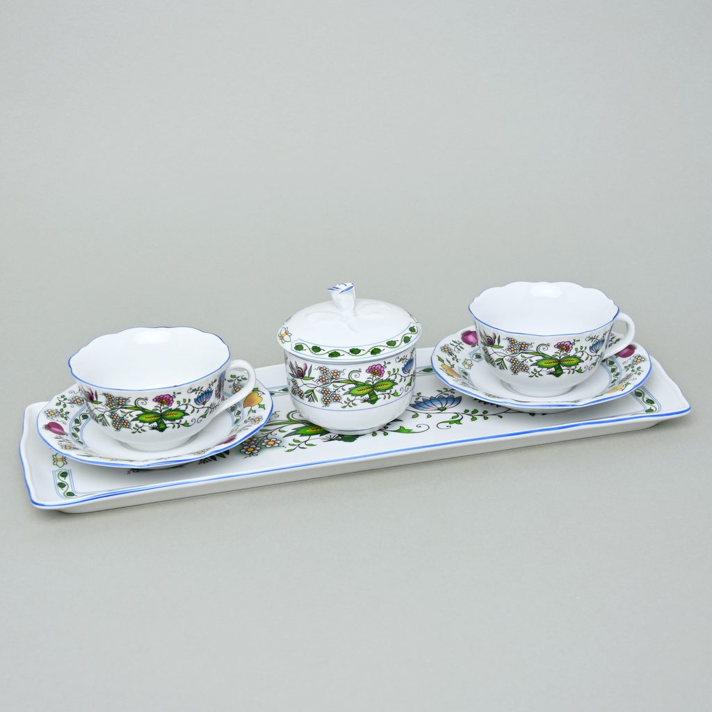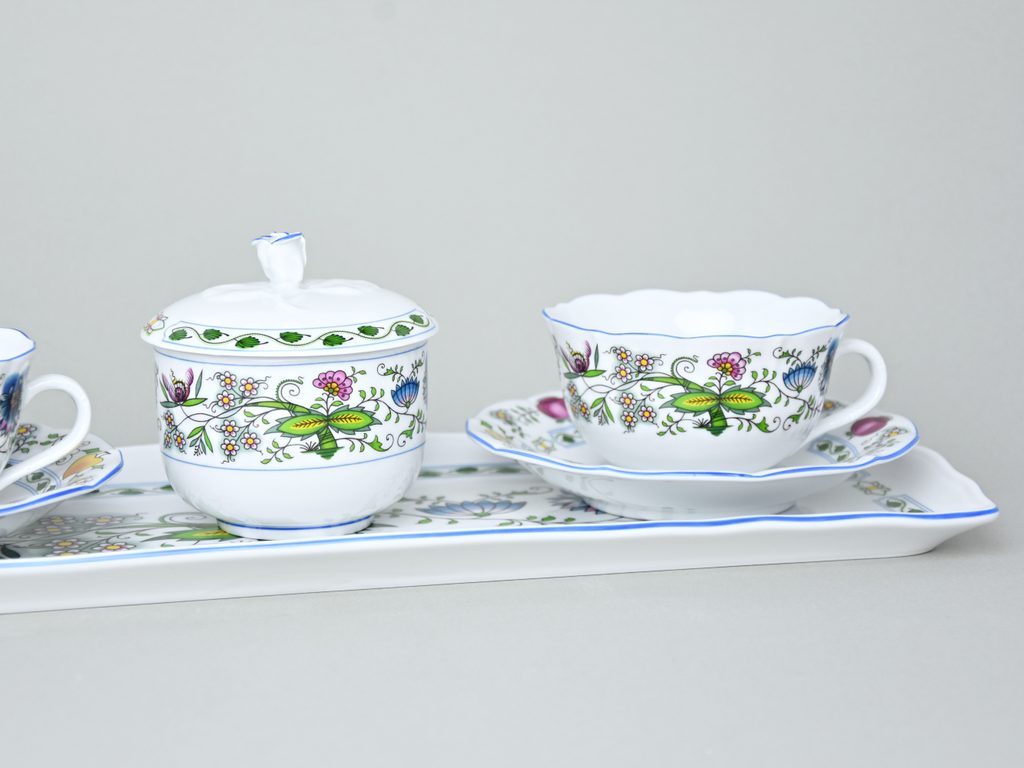 2x šálek 210 ml na čaj a podšálek + cukřenka 200 ml + podnos 45 x 16 cm, dekor barevný cibulák
