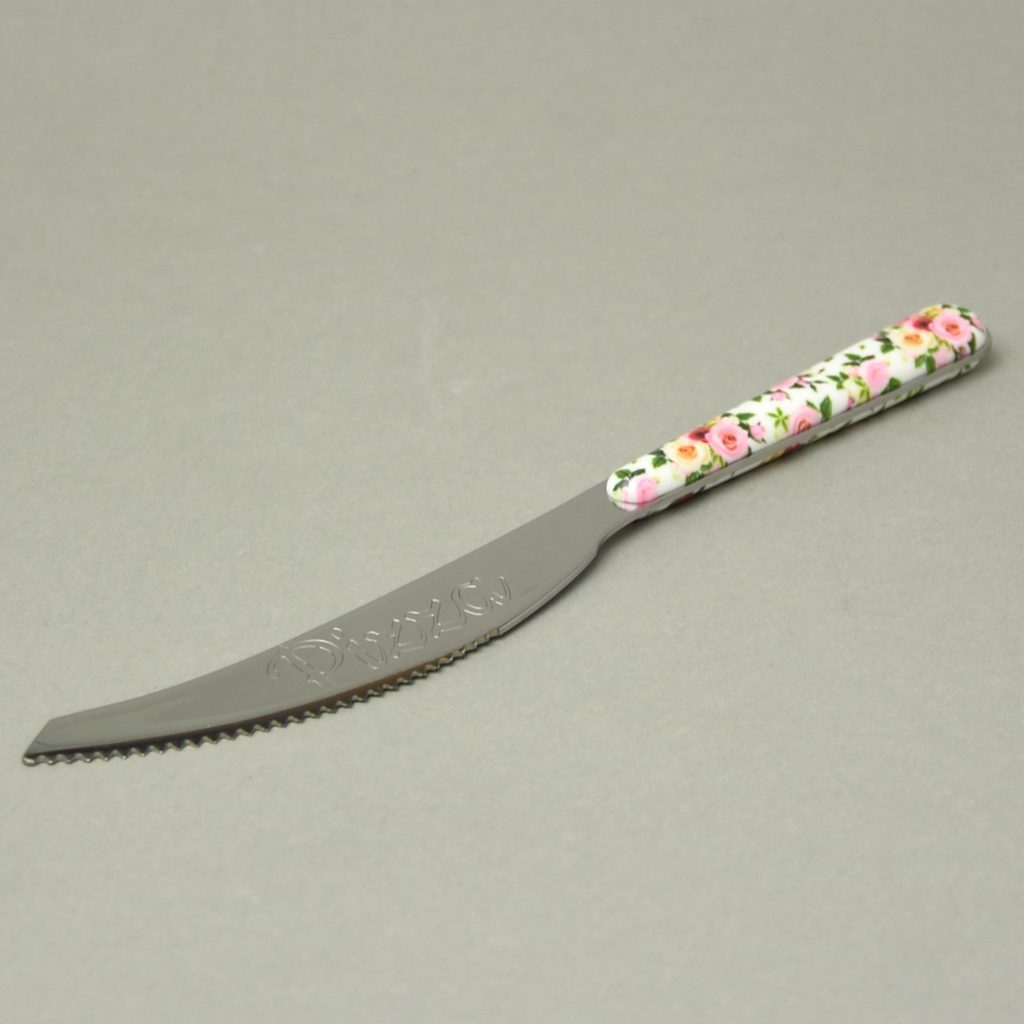zahnutý nůž na krájení pizzy se zoubky pro snažší řez, řada BISTROT ROSES, leštěno do vysokého lesku, nerezová ocel 18/10, plastová rukojeť, krásný sublimovaný nesmytelný dekor - barevné růžové a fialové růže