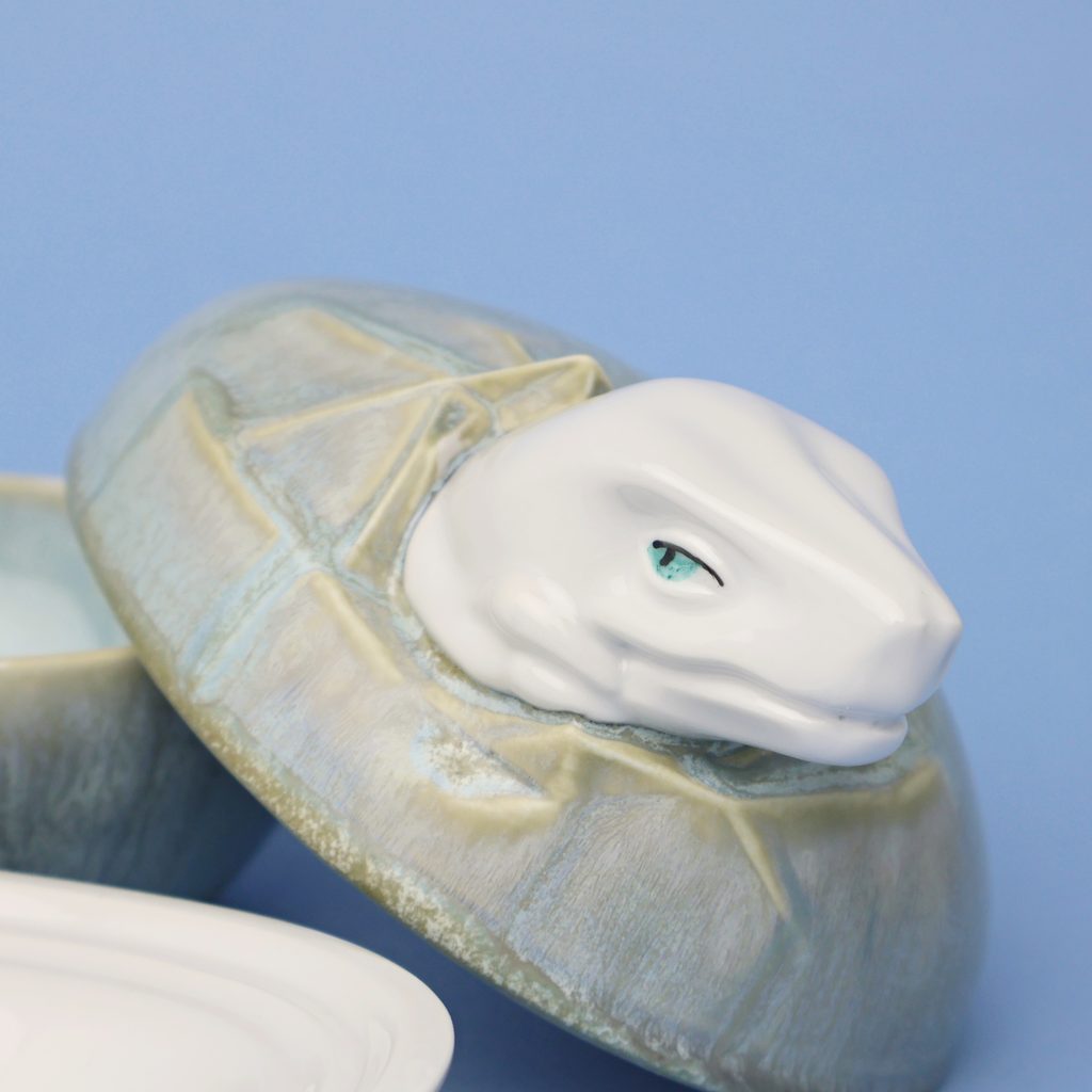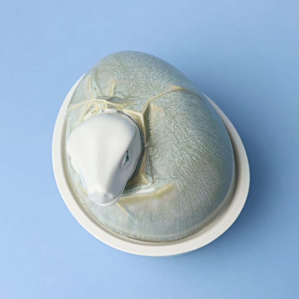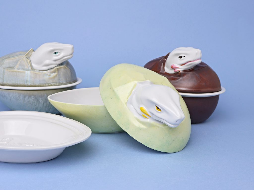 Dětská porcelánová jídelní sada pro milovníky dinosaurů. Zcela originální a ručně dekorované dinosauří vejce se skládá z hlubší misky, talířku s vyobrazenou zkamenělinou a víka s hlavou mláděte.