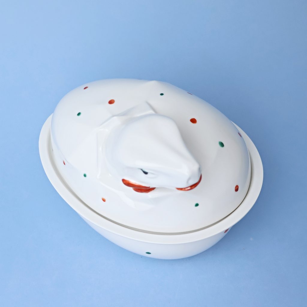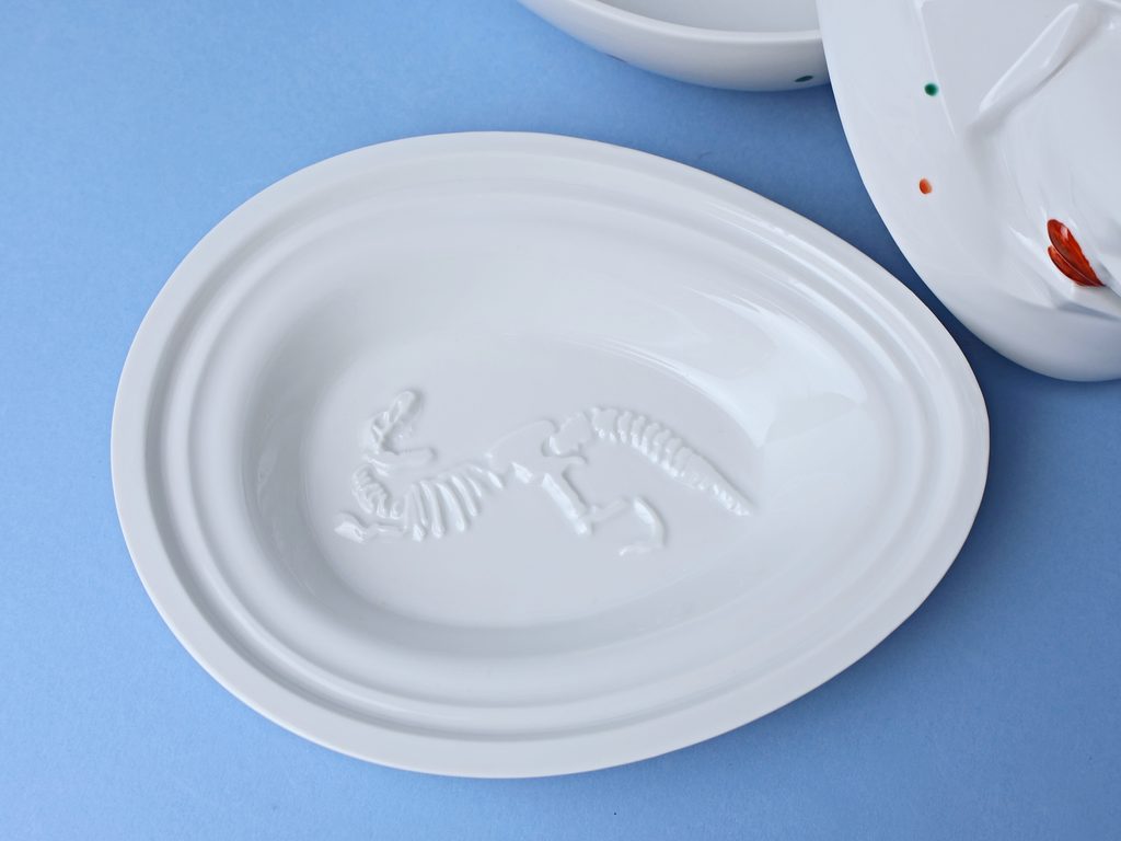 Dětská porcelánová jídelní sada pro milovníky dinosaurů. Zcela originální a ručně dekorované dinosauří vejce se skládá z hlubší misky, talířku s vyobrazenou zkamenělinou a víka s hlavou mláděte.