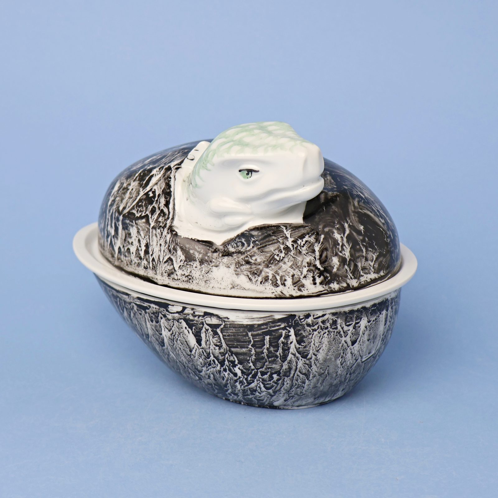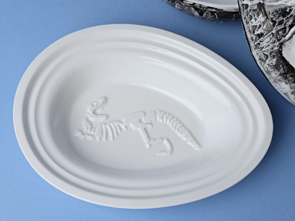 Dětská porcelánová jídelní sada pro milovníky dinosaurů. Zcela originální a ručně dekorované dinosauří vejce se skládá z hlubší misky, talířku s vyobrazenou zkamenělinou a víka s hlavou mláděte.
