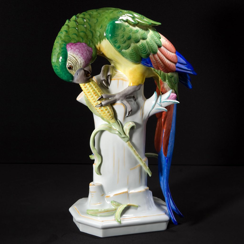 Papoušek s kukuřicí 30 x 18 x 39 cm, Arthur Storch, Porcelánové figurky Gläserne Porzellanmanufaktur