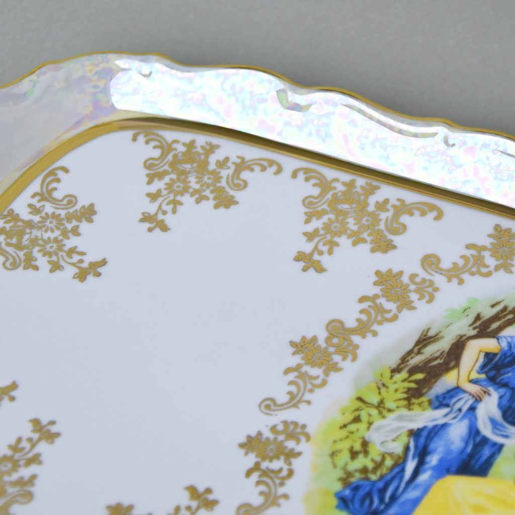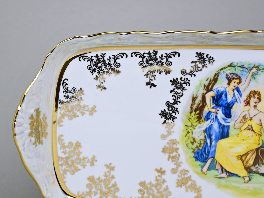 Krásný zdobný podnos perleťové barvy s vyobrazením tří grácií uprostřed podnosu. Bohatě dekorováno zlatými detaily květinového charakteru.