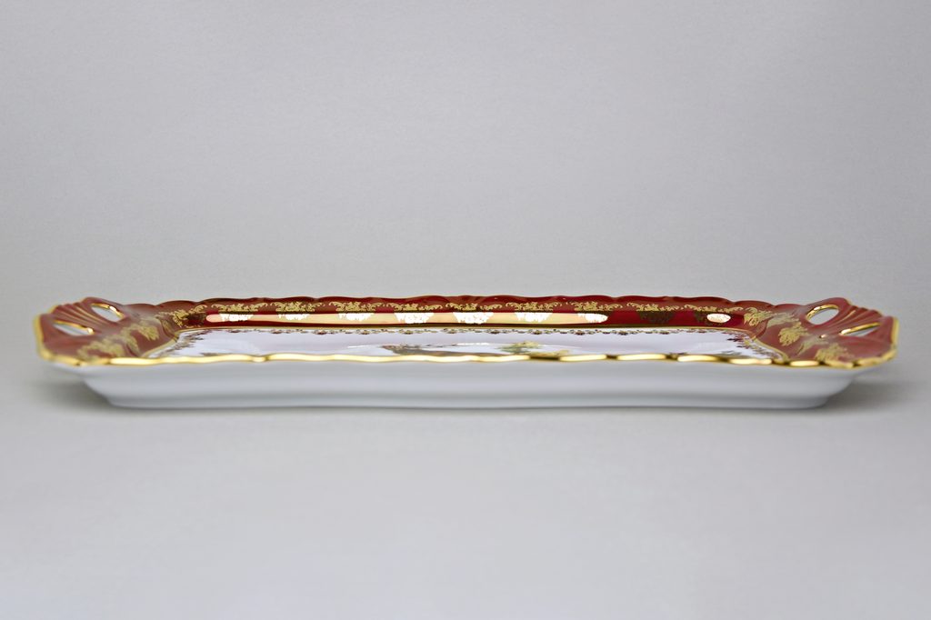 Bohatě dekorovaný podnos plochý obdélníkový s uchy, lovecký motiv s rubínovou červení a zlatem. Na třetím obrázku je zobrazení rubínové červeně nejvěrnější.