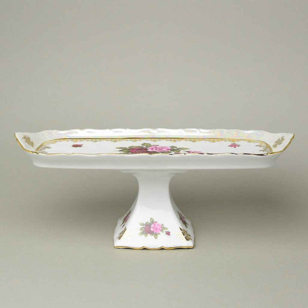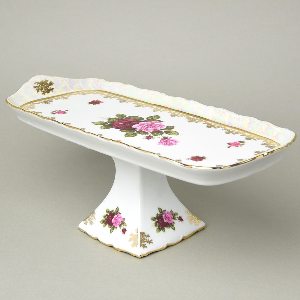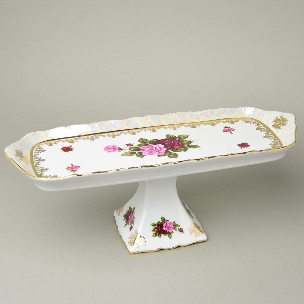 36 x 15 cm, porcelán Verona, dekorace Queens Crown (dílna u Karlových Varů), podnos se zlato-růžovo-perleťovým dekorem a růžemi Cecily, na noze, celková výška výrobku 13 cm