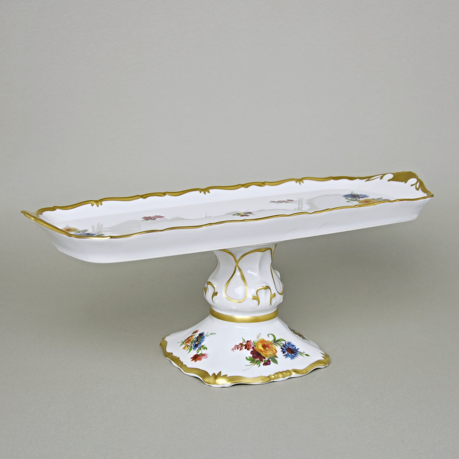 Nádherně dekorovaný podnos 36 x 15 cm, na noze, výška 13,5 cm. Zdoben matným zlatem (barvou) a kvítím.