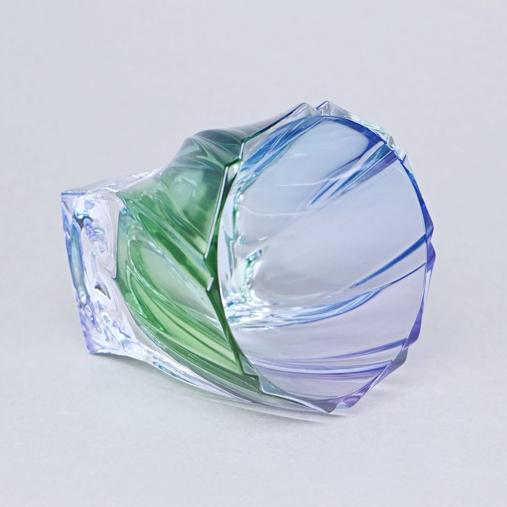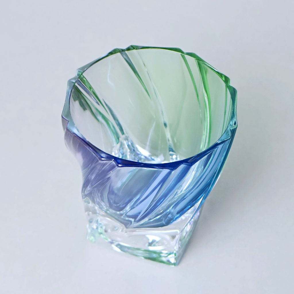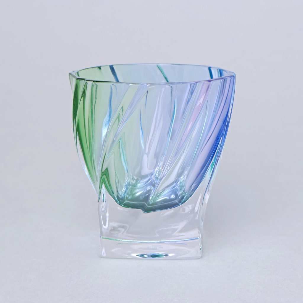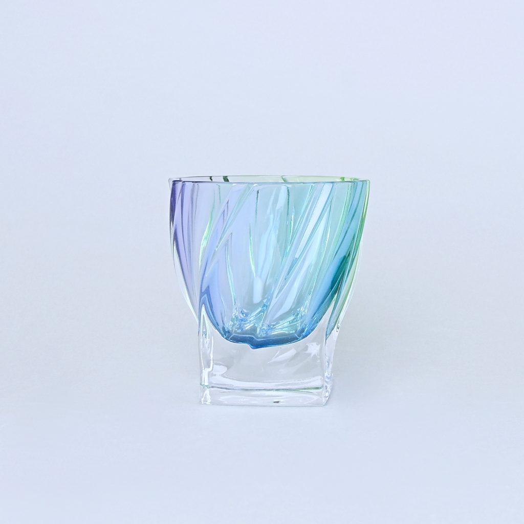 Krásná designová sklenice tvaru Ponti na whisky / vodu z bytelného křišťálu. Atypický tvar. Kvalitní český olovnatý křišťál 24% PbO, ručně dekorováno duhovými barvami (fialová, modrá, zelená).