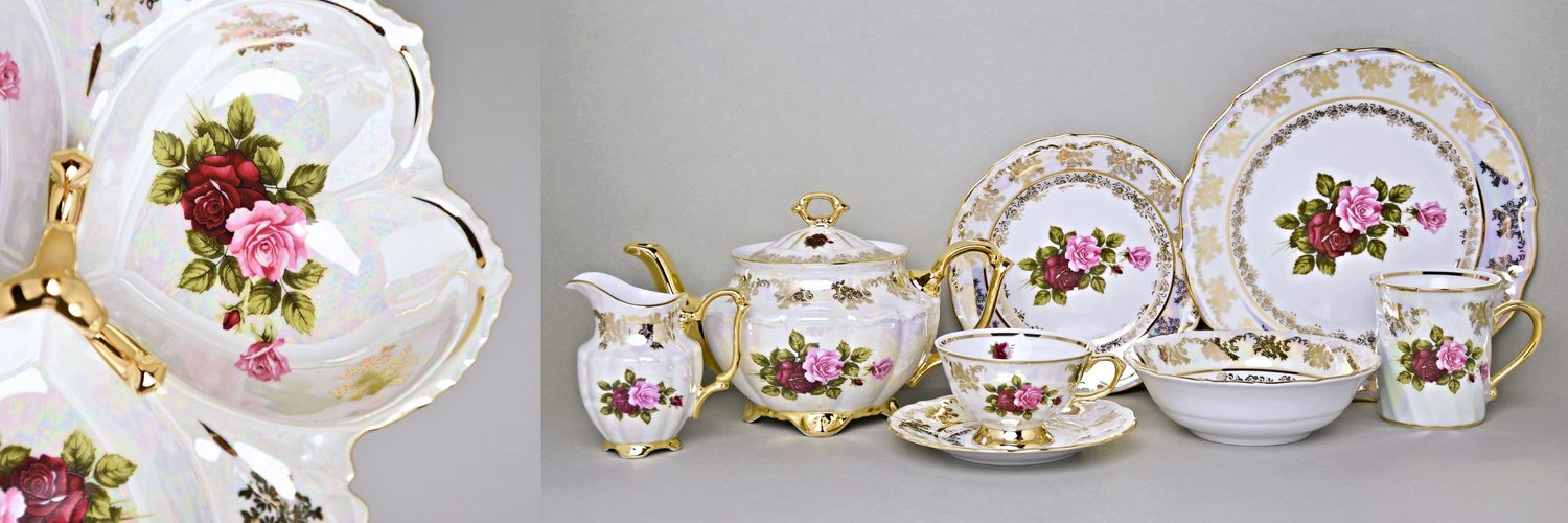 Oblíbený dekor nazývaný Cecily - růže s perletí a zlatem. Velmi populární mimo jiné v zemích se zákazem vyobrazení zvěře či lidských motivů. Vyrábí malinká manufaktura Carlsbad, či QUEENs CROWN / Royal Queen u Karlových Varů.
