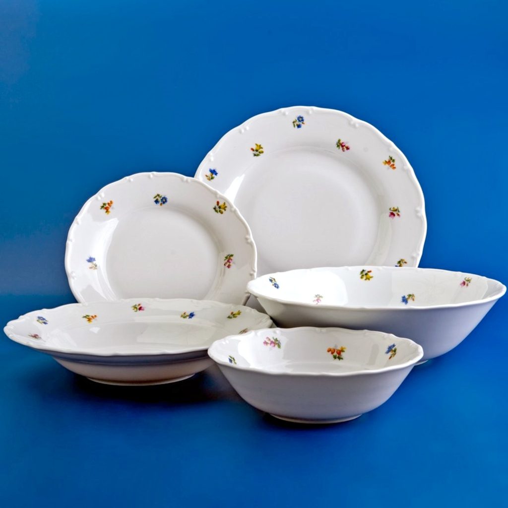 Nejoblíbenější porcelán ze Staré Role, tvar Ofelie. Jednoduchý tvar s decentním reliéfem po okraji. KVĚTINOVÝ DEKOR HÁZENKA. Příjemná hmotnost, desítkami let prověřený porcelán pro běžné použití. 6x talíř mělký 25 cm, 6x talíř hluboký 24 cm, 6x talíř dezertní 19 cm, 6x praktická miska 16 cm, 1x mísa hluboká 23 cm.