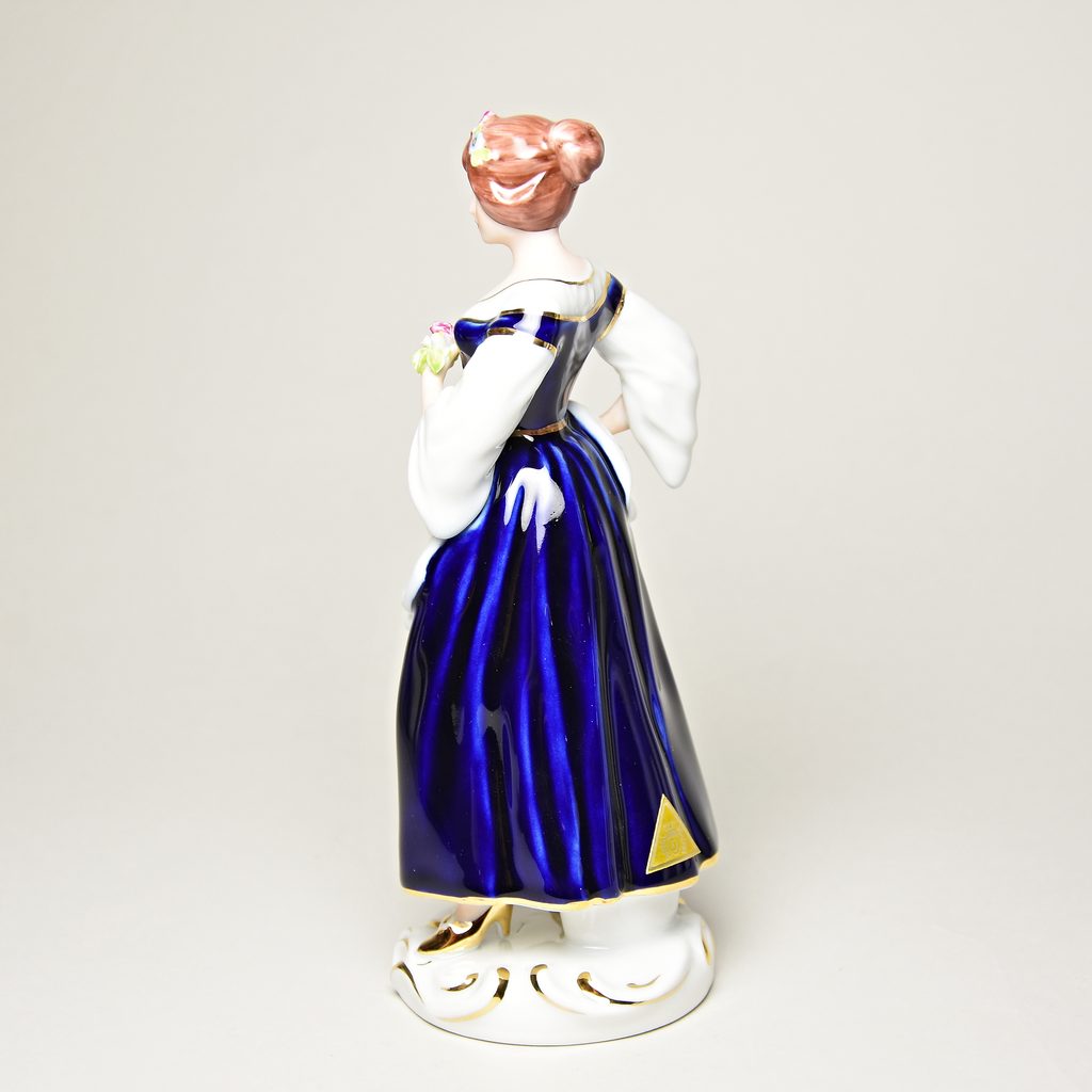 Porcelánová figurka "Dáma s květinou" z tradiční manufakturní dílny Duchcov (Royal Dux Bohemia). Detaily zdobené zlatem.