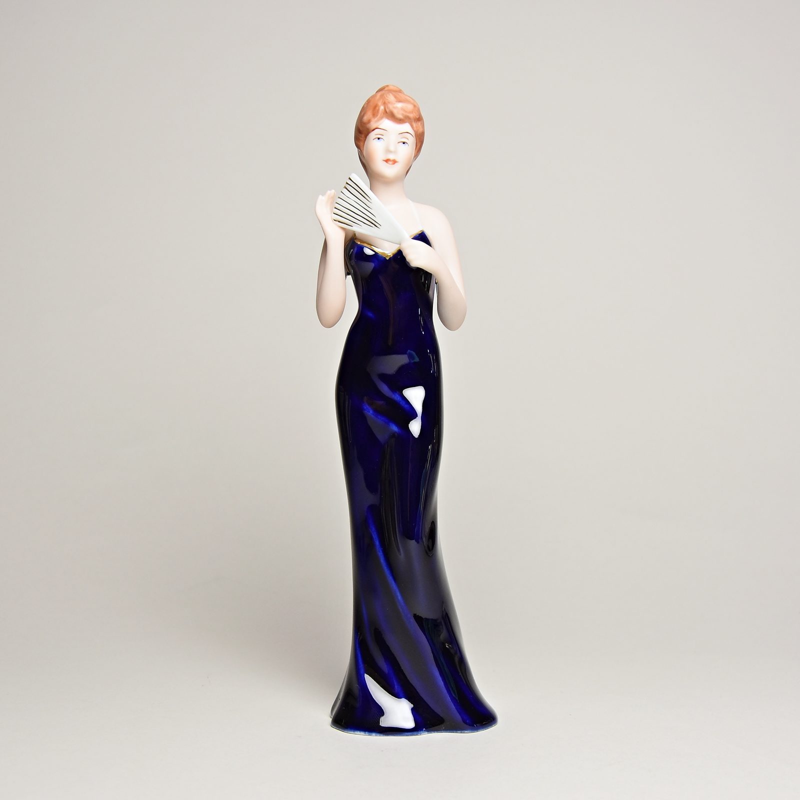 Porcelánová figurka "Dáma s vějířem" z tradiční manufakturní dílny Duchcov (Royal Dux Bohemia). Elegantní dáma v dlouhých večerních šatech. Zlatě zdobené detaily.
