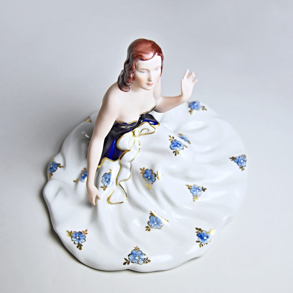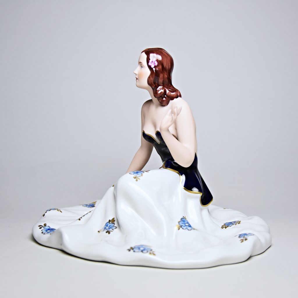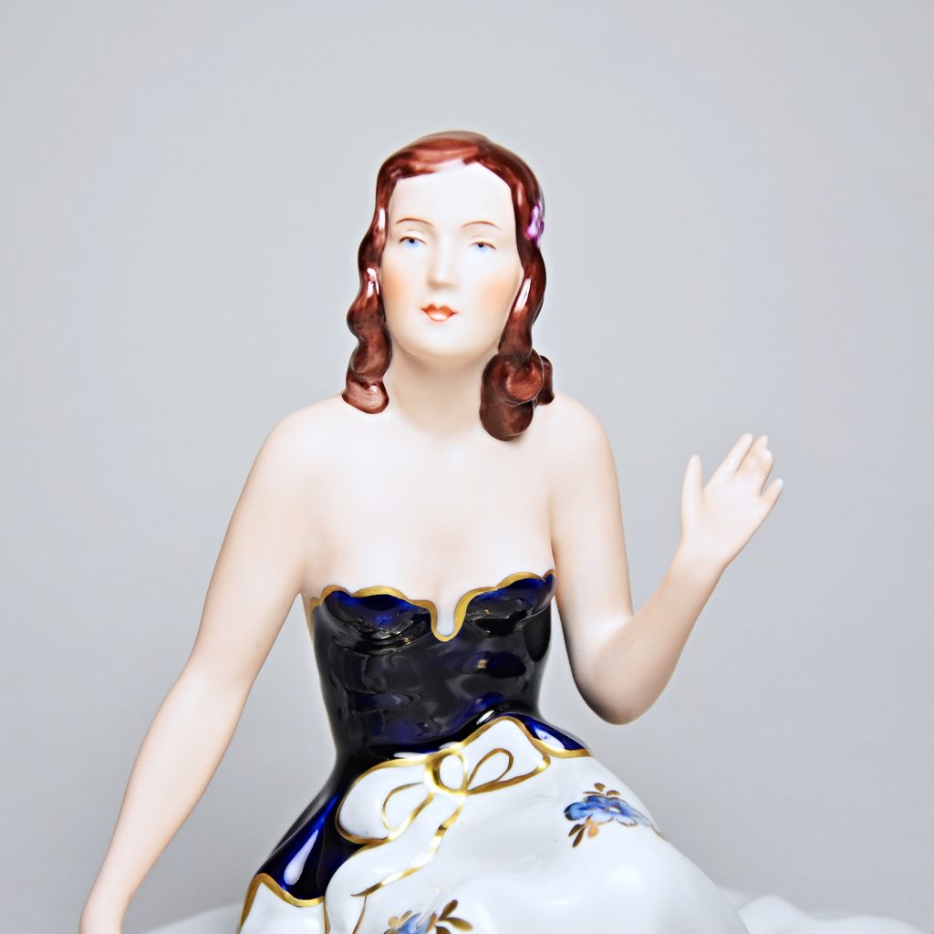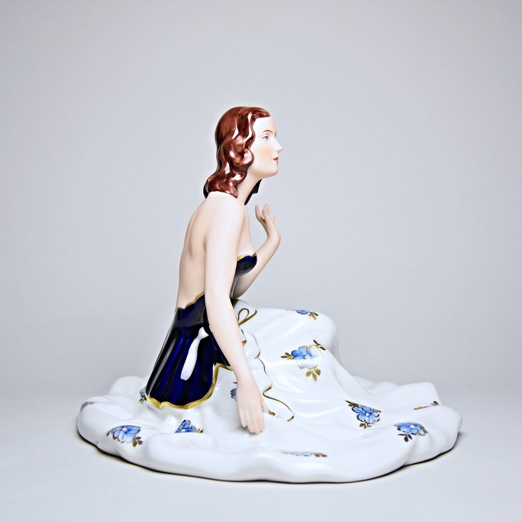 Porcelánová figurka elegantní sedící dámy v dlouhé sukni zdobené květinami. Vyrobeno v tradiční české dílně Duchcov (Royal Dux Bohemia). Zlatě zdobené detaily. Kobaltová modř - Isis.