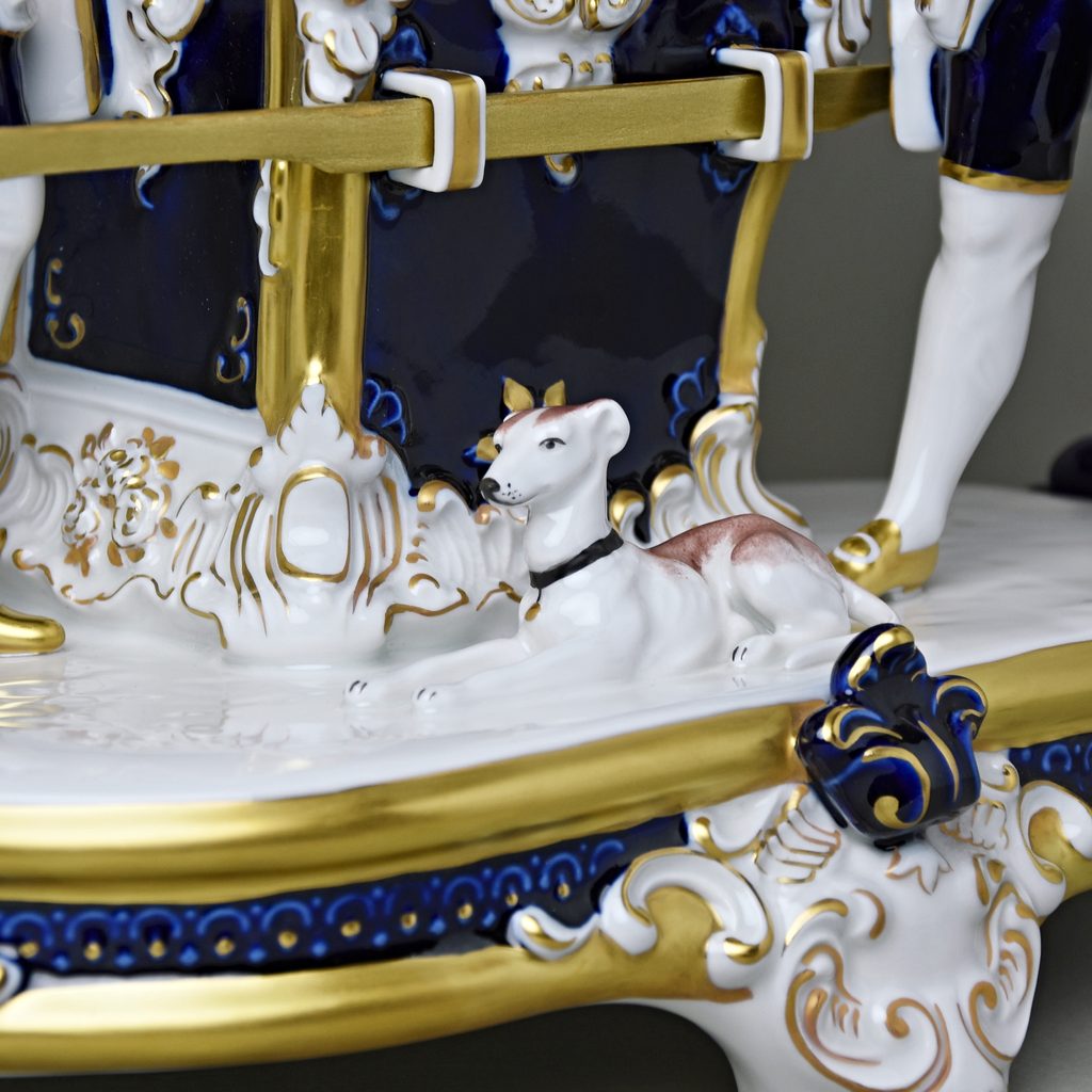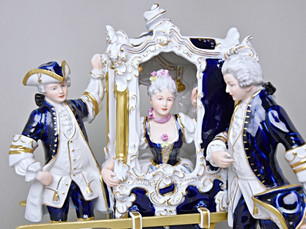 Velká porcelánová figura z tradiční dílny Duchcov (Royal Dux Bohemia). Ručně dekorováno. Vyobrazení dívky v nosítkách a dvou pánů.