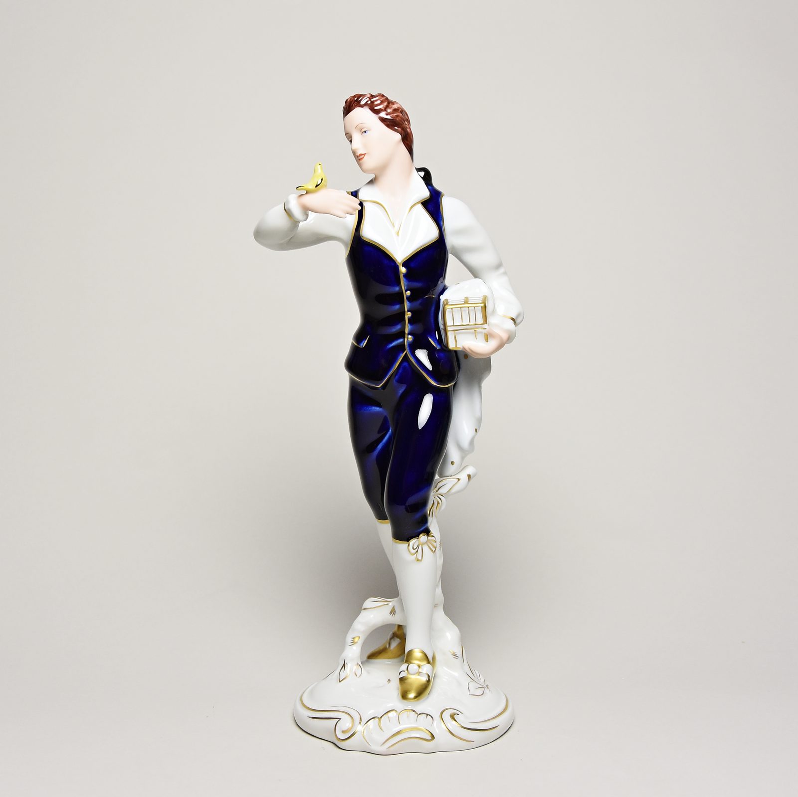 Porcelánová figurka "Ptáčník" z tradiční manufakturní dílny Duchcov (Royal Dux Bohemia). Elegantní figura pána s malým žlutým ptáčkem na ruce. Zlatě zdobené detaily.