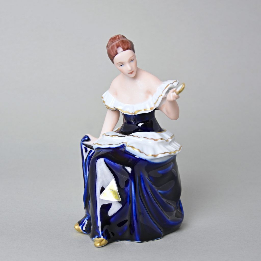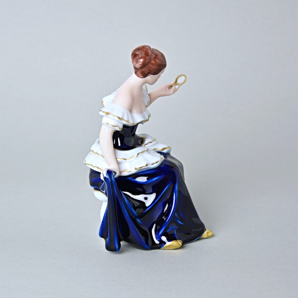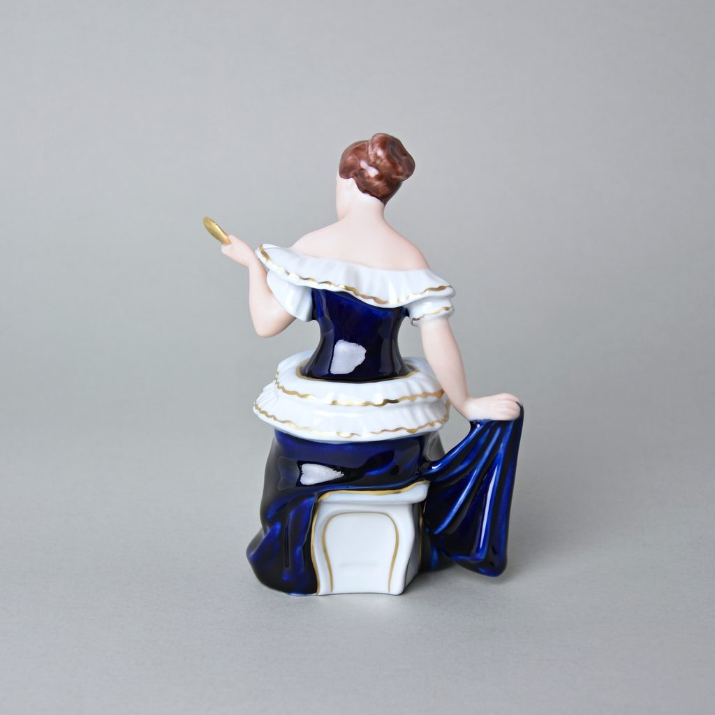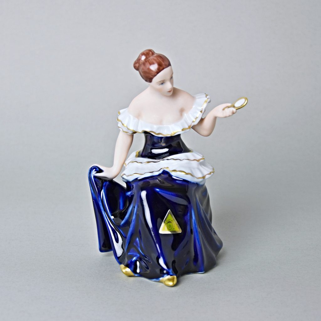Porcelánová figurka sedící dámy se zrcátkem v ruce. Krásné modré kobaltové šaty s volány.