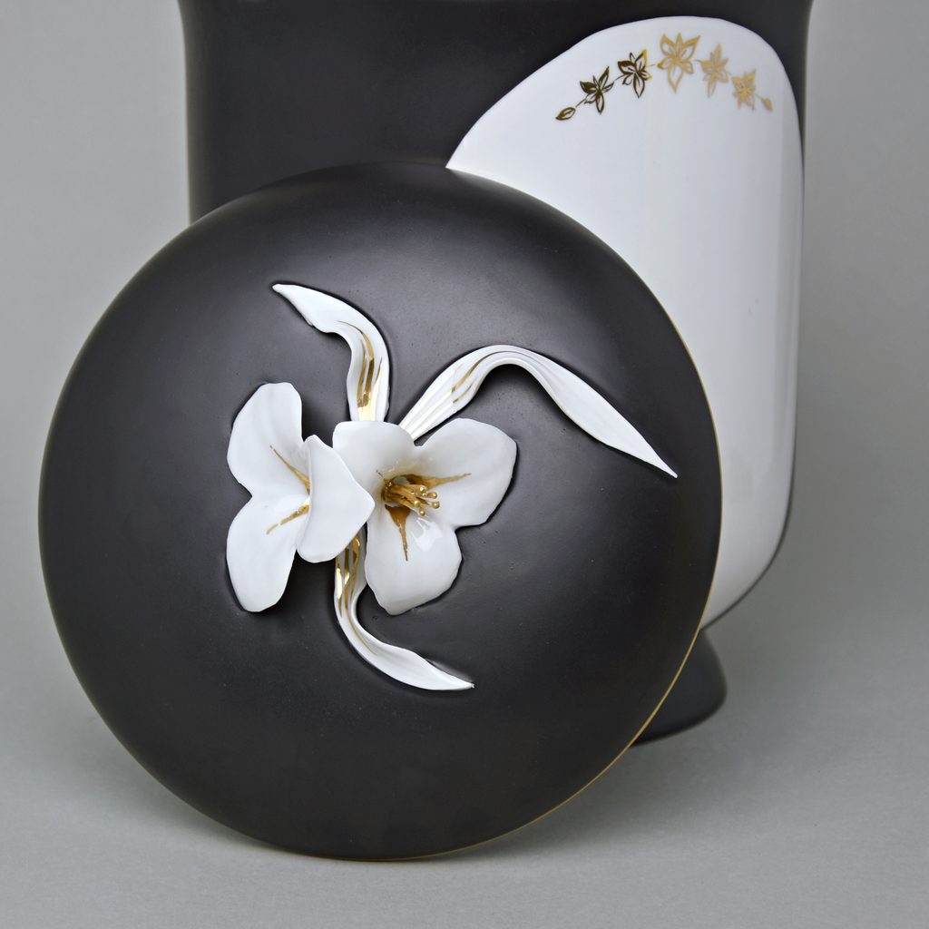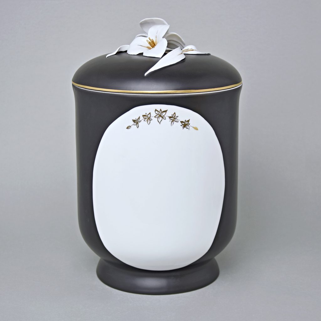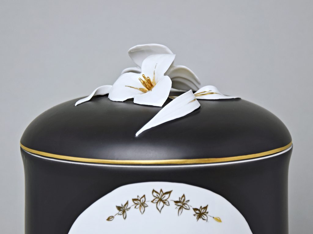 Porcelánové pouzdro na urnu / pohřební urna s víkem zdobeným bílými liliemi se zlatem. Bílá lilie má při smutečních obřadech výraznou symboliku, spojovanou s duší zemřelého. Naznačuje, že se jeho duše vrátila do mírového stavu nevinnosti. V křesťanství navíc tato květina symbolizuje čistotu, panenství záři duše