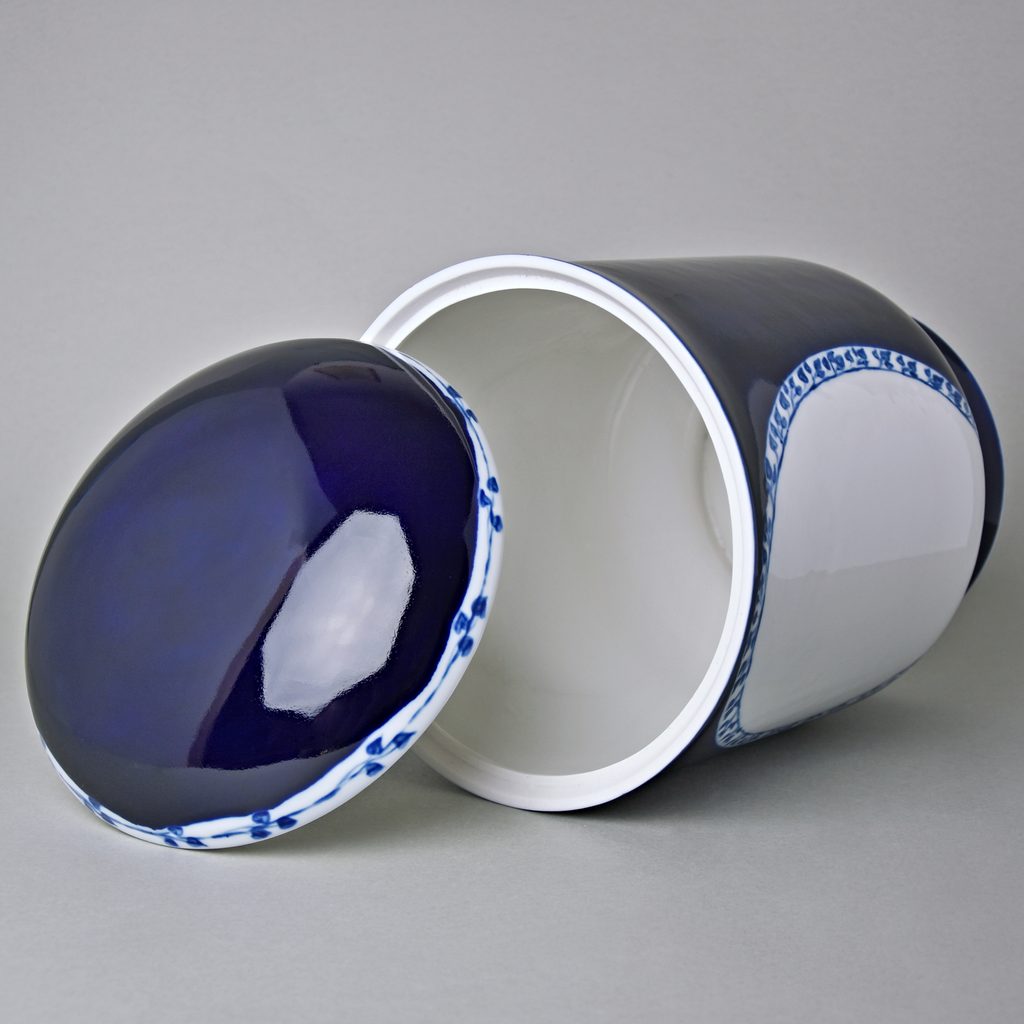 Porcelánové pouzdro na urnu / pohřební urna s víkem. Výška 27 cm, průměr 19,5 cm. Vyrobeno v české manufaktuře Duchcov (Royal Dux Bohemia). Uprostřed místo na fotografii, či text zesnulého.