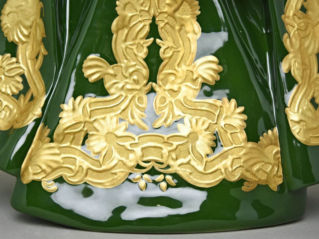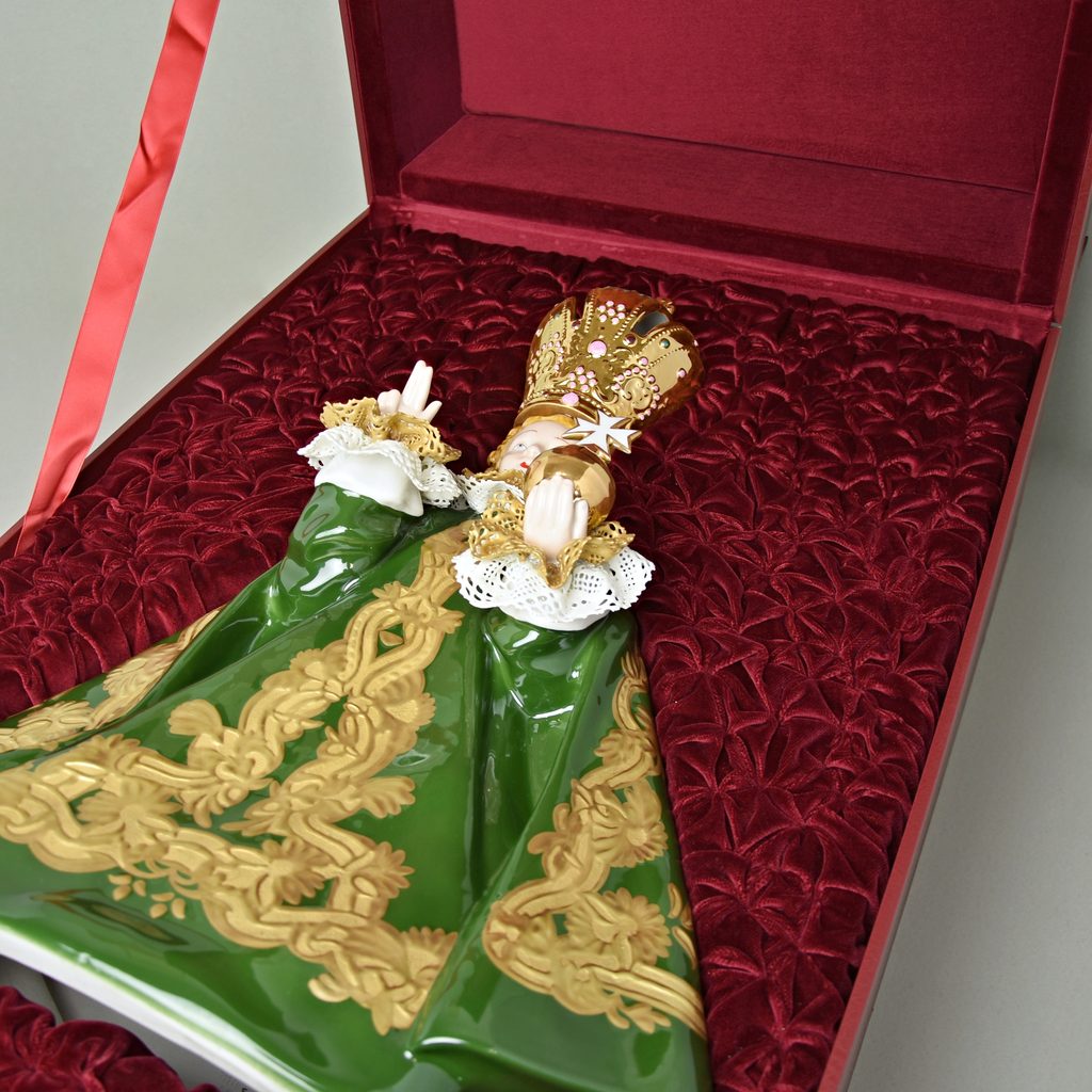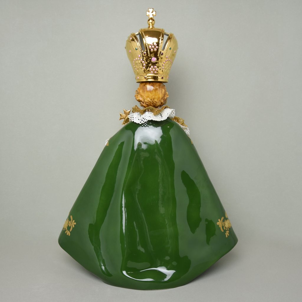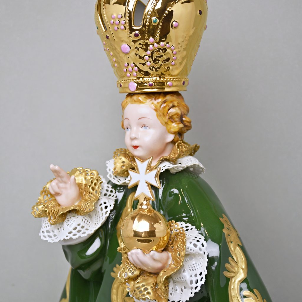Pražské Jezulátko z porcelánu - velká porcelánová figura. Vyrobeno ještě v tradiční manufaktuře Duchcov (Royal Dux Bohemia). Jezulátko v zelené barvě a bohatě zdobené zlatem. Ideální do kostela nebo kaple.