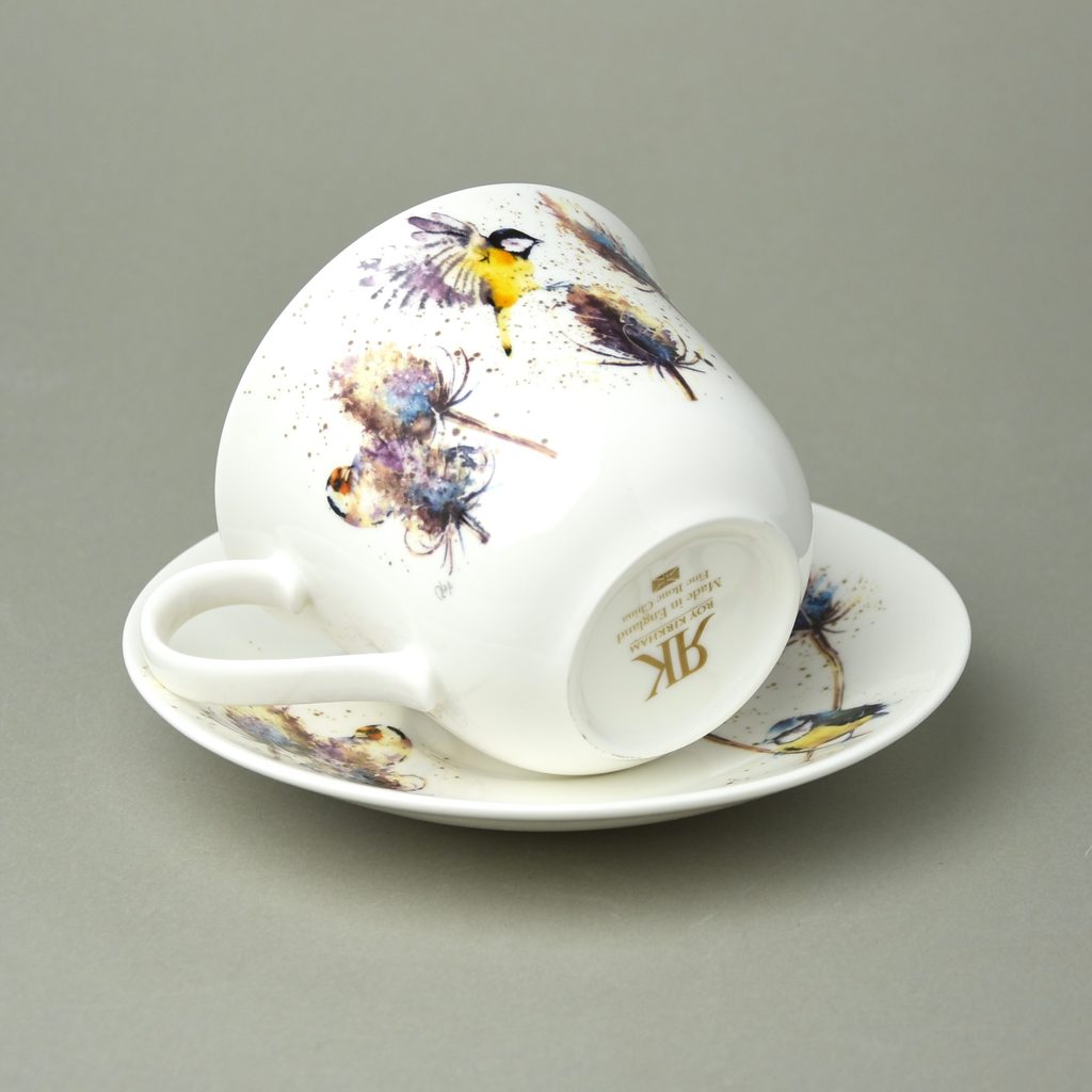 Ptáčci na bodláku: Šálek 420 ml a podšálek 17 cm snídaňový, anglický kostní porcelán Roy Kirkham