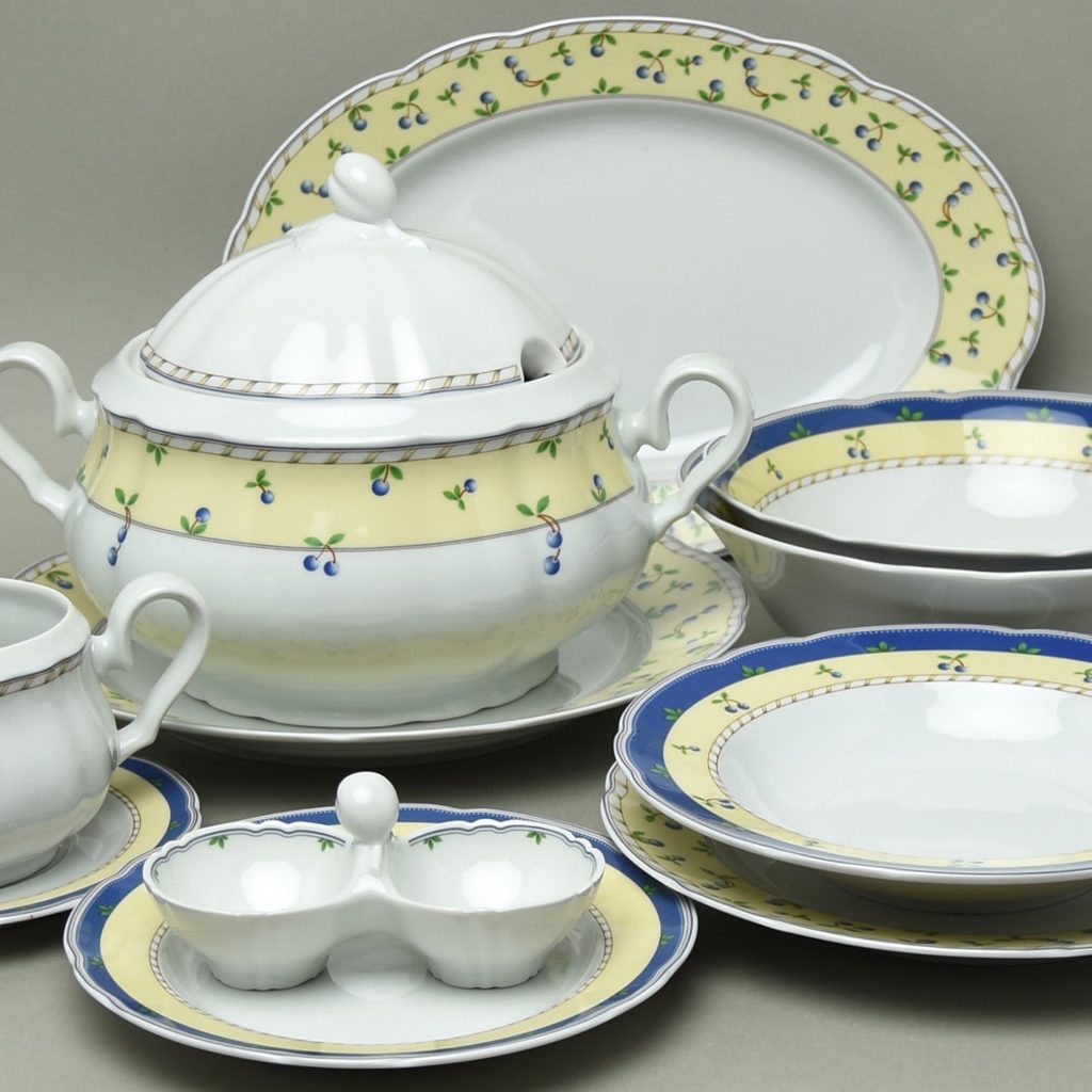 krásná jídelní sada tvaru Rose z Thunské porcelánky, dekor 80147 švestičky / trnky, 6x talíř mělký 25 cm, 6x talíř hluboký 23 cm, 6x talíř dezertní 19 cm, mísa polévková 2,6 l, mísy kompotové 25 a 23 cm, omíčník 500 ml s podomáčníkem, dvojmistička sůl/pepř, mísa mělká kulatá (klubový talíř) 30 cm, mísa oválná 36 cm