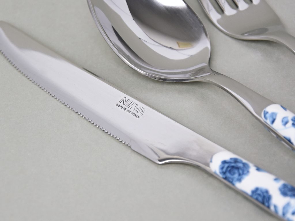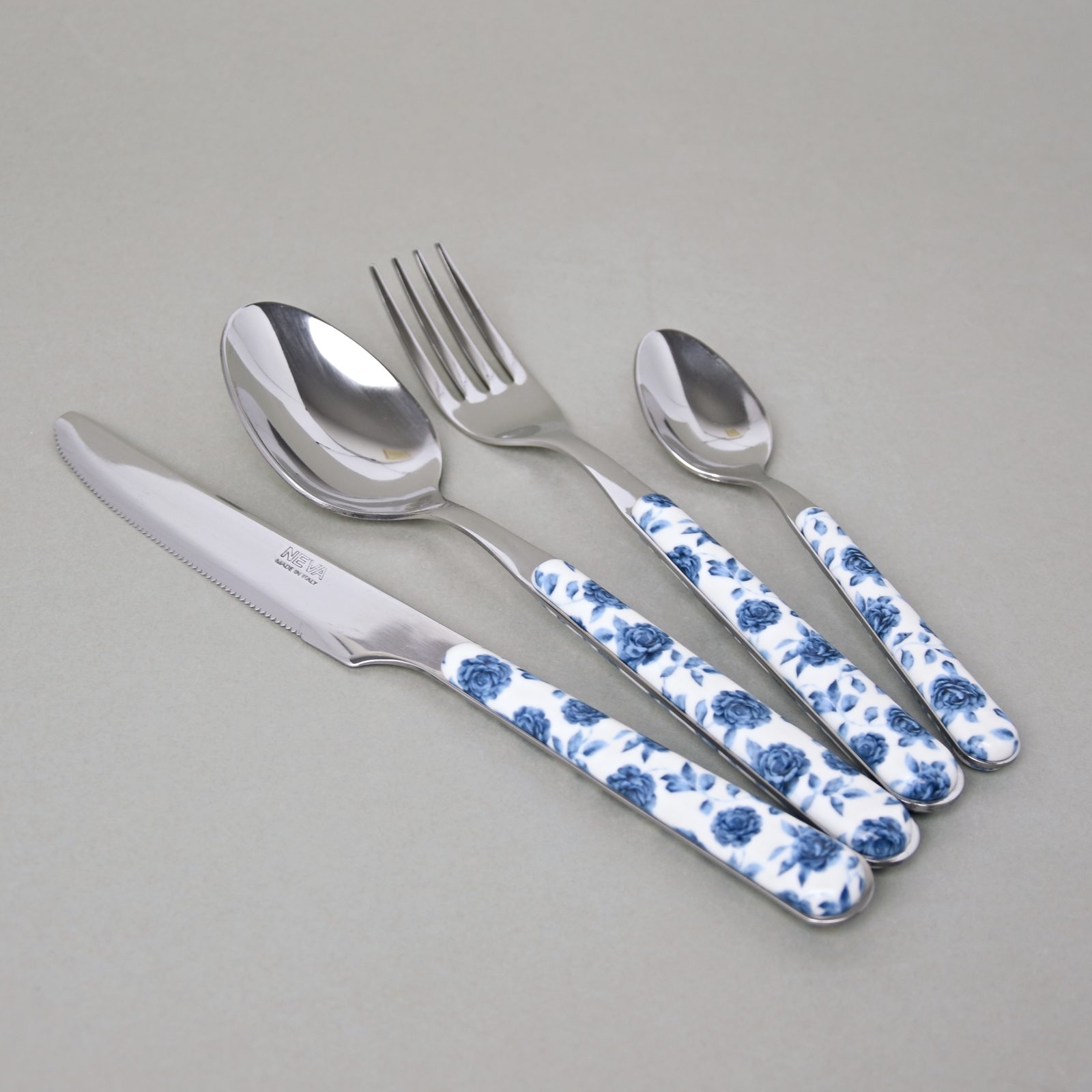 6x jídelní nůž, vidlička, lžíce a lžička kávová, řada BISTROT Vintage Floreal, dekor 14006 (modrá růže), leštěno do vysokého lesku, nerezová ocel 18/10, plastová rukojeť, sublimovaný nesmytelný dekor