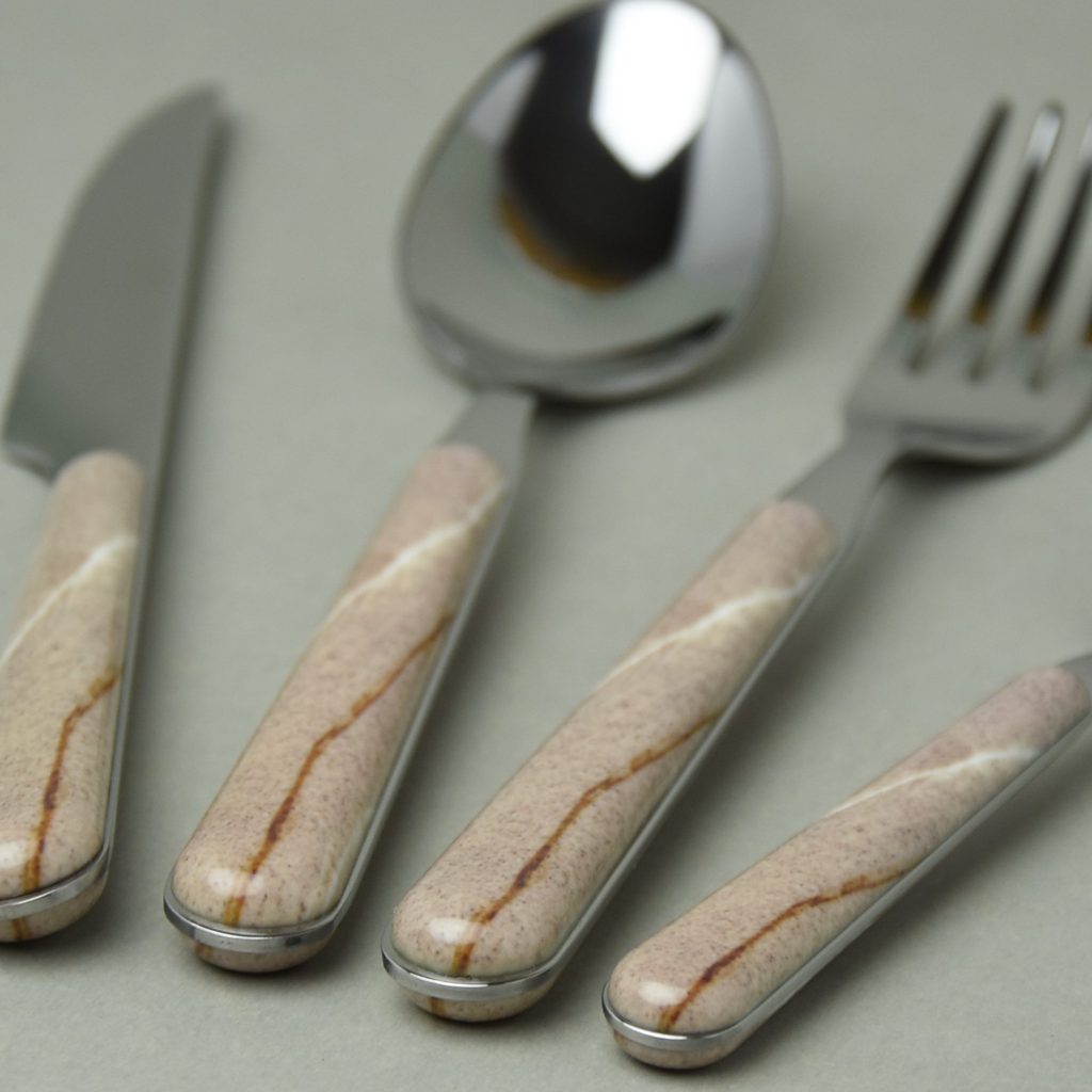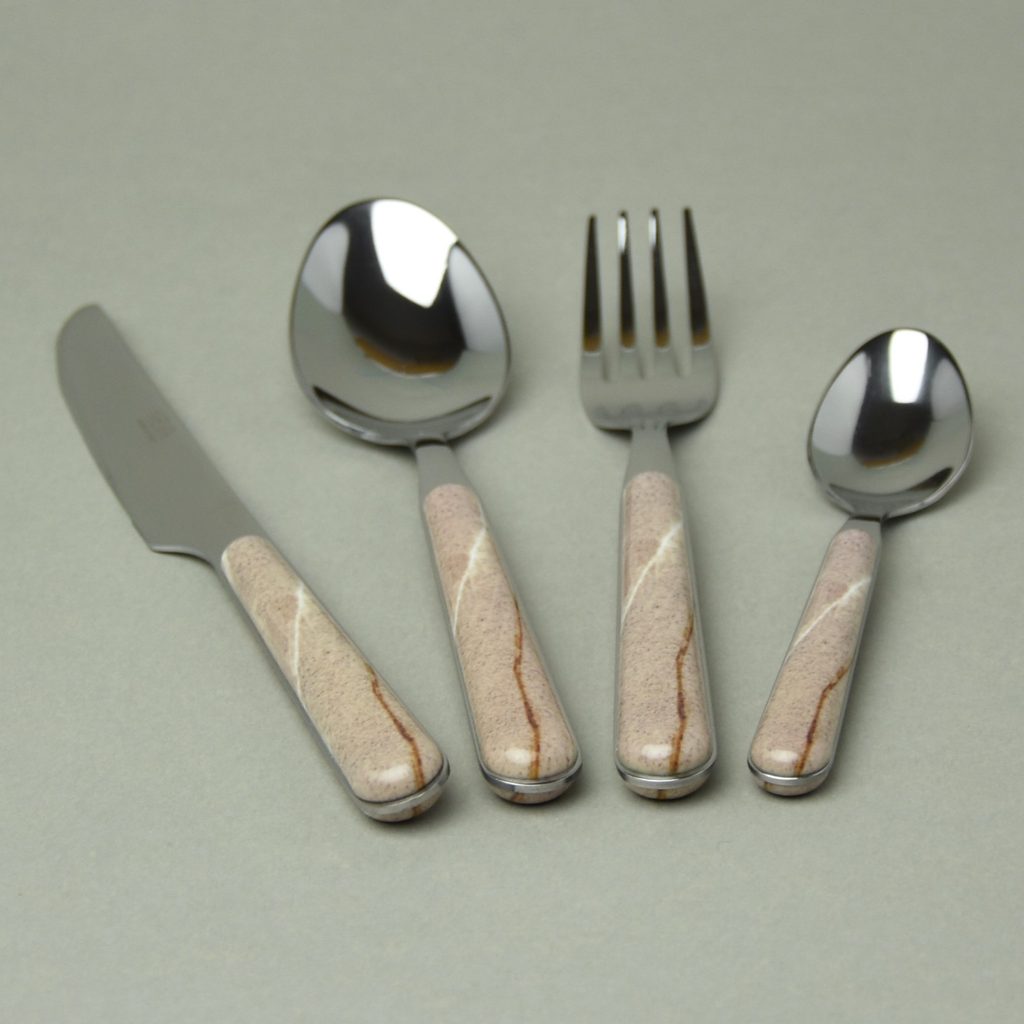 6x jídelní nůž (47 g - 22 cm), vidlička (45 g - 19,8 cm), lžíce (64 g - 20 cm) a lžička kávová (29 g - 14,5 cm), řada TEXTURE PIETRA, pískový / mramorový dekor, leštěno do vysokého lesku, nerezová ocel 18/10, plastová rukojeť, sublimovaný nesmytelný dekor - Italové - mistři designu - krásný dekor