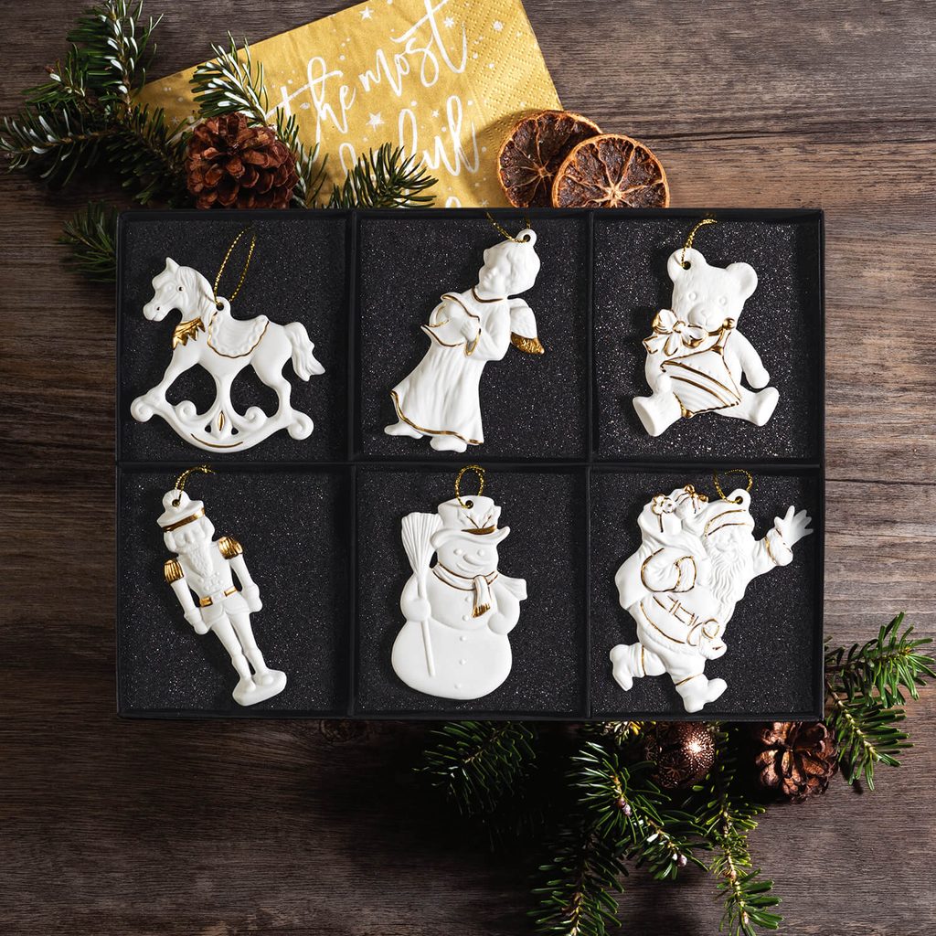 6 vánočních ozdob závěsných z biskvitového porcelánu dekorovaných zlatou linkou v pěkné dárkové krabičce (255 x 20 x 185 mm)