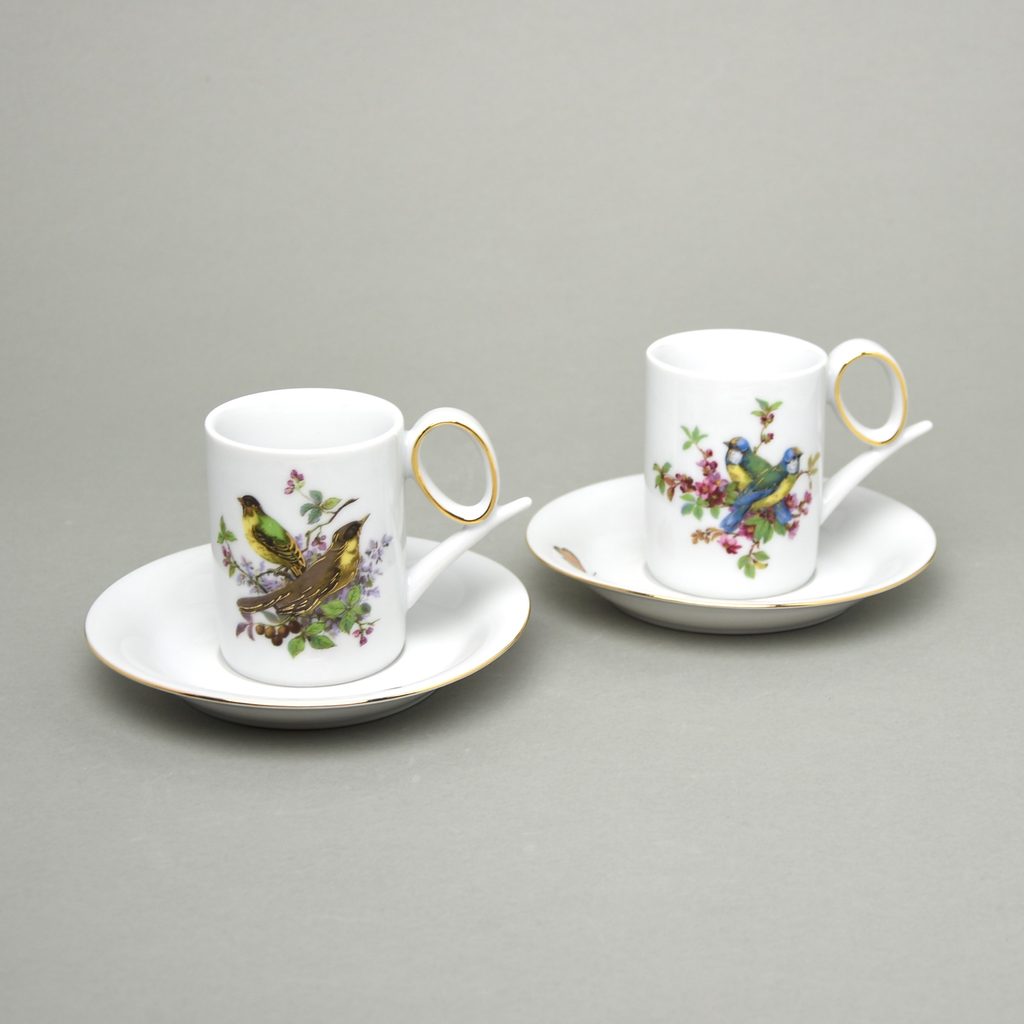 výška šálku 7,6 cm, šířka 5,9  cm, dárkový krabička, cca 12 různých náhodných velmi povedených ptačích krásně barevných dekorů - obrázek je tedy pouze ilustrativní - 1 ks šálku a podšálku