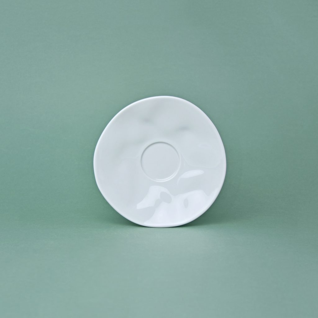 Krásný designový porcelánový šálek a podšálek na kávu. Atypický nepravidelný "pomačkaný" tvar kolekce FLAMENCO. Nedekorováno - čistě bílé. Vyrobeno v České republice v porcelánce G. Benedikt 1882, pod jednou z jejich původních značek Lilien Austria.