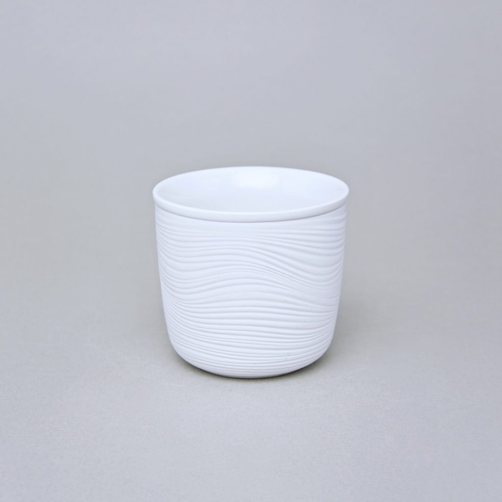 šálek s dvěma stěnami, na horký (např. káva, čaj) či studený obsah (zmrzlina), který si díky speciální konstrukci šálku uchová teplotu a zároveň si nepopálíte prsty - vnější stěna v neglazovaném reliéfním provedení Curly raw, vnitřek a okraj šálku je glazurovaný