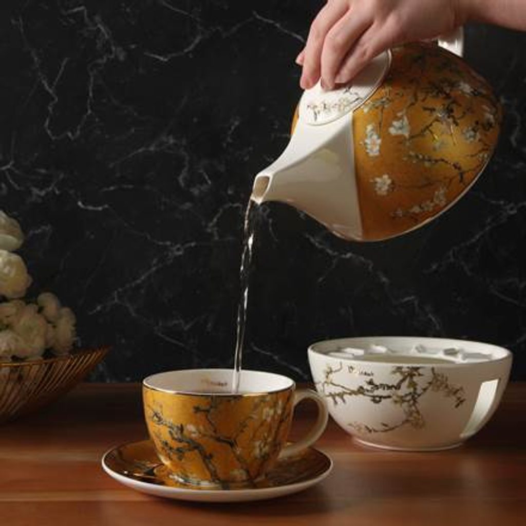 šálek a podšálek z jemného kostního porcelánu s motivem od van Gogha Mandlovník (nakvetlé větévky tohoto krásného zástupce rodu Prunus), ve zlaté variantě, 330 g