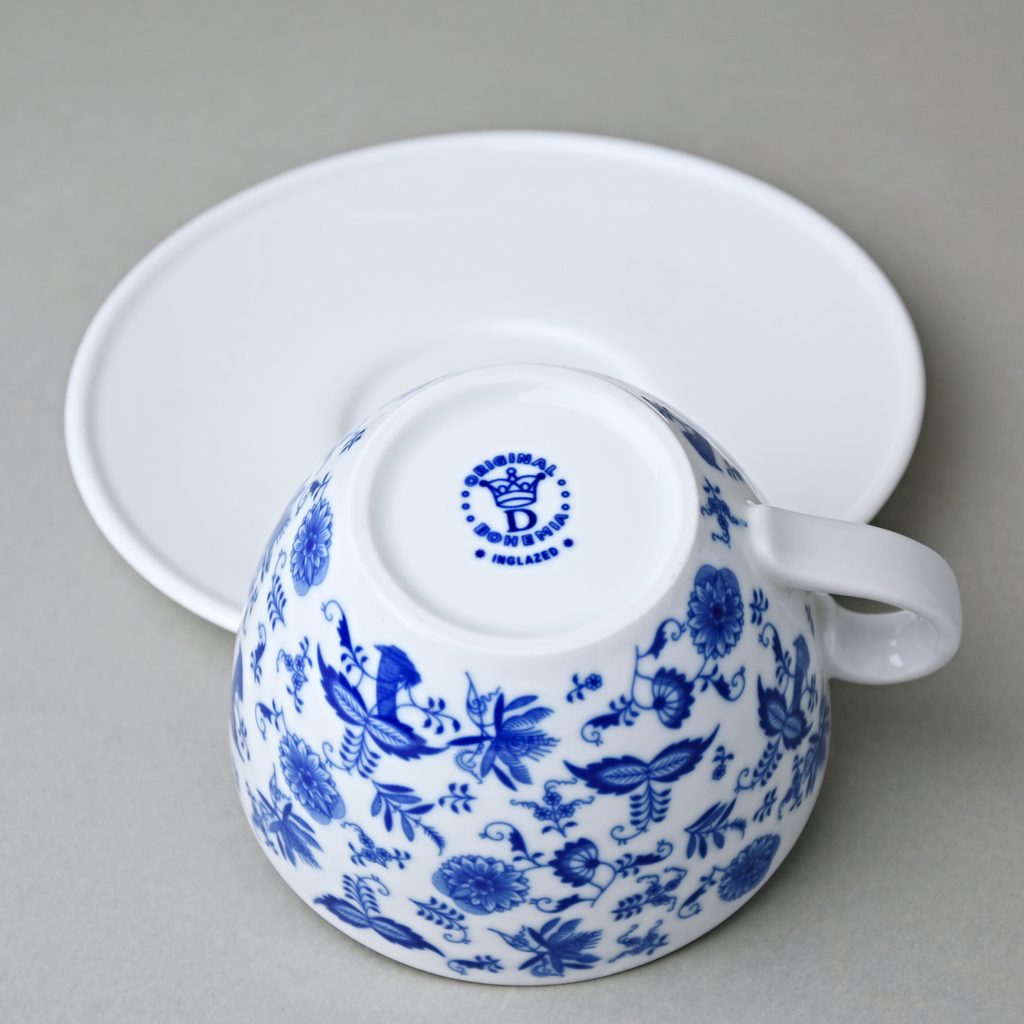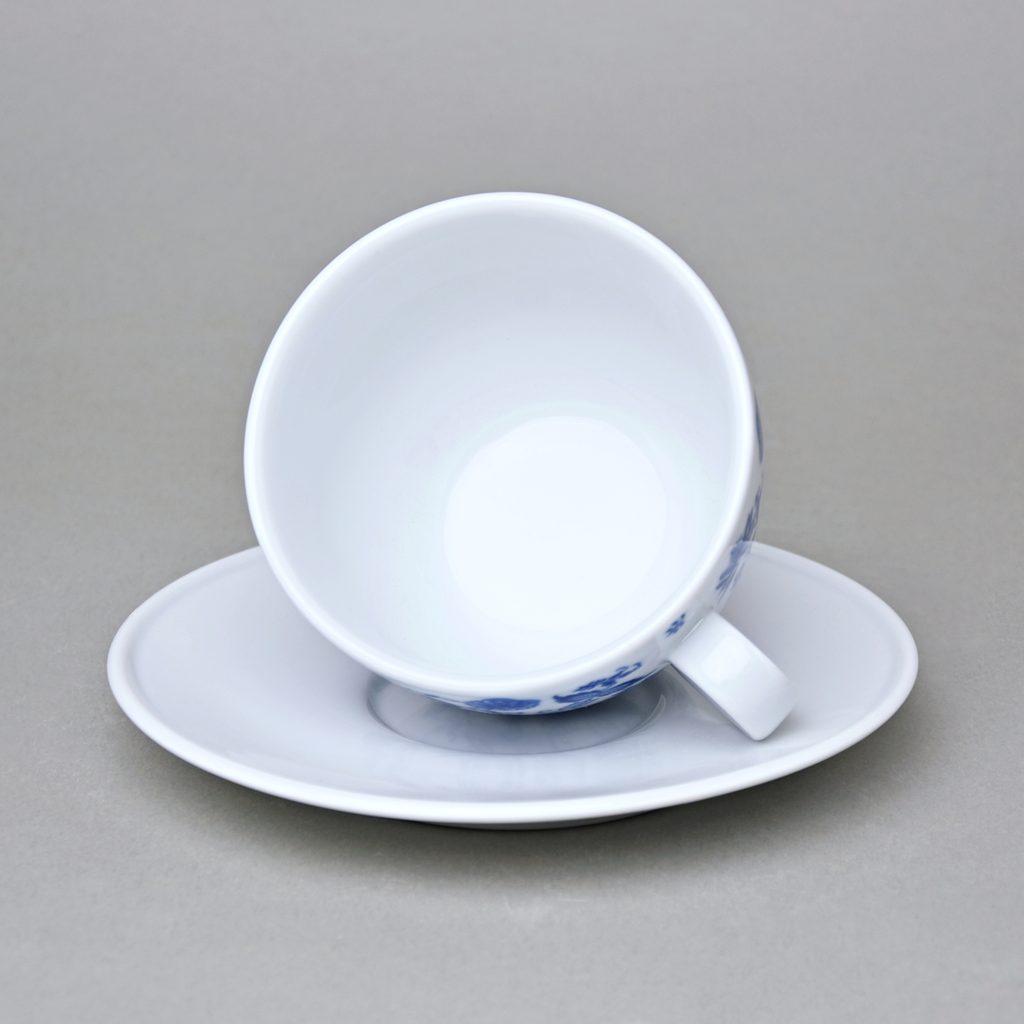Silnostěnný porcelán, tvar Milada. V dekoru šálku jsou malé fragmenty cibulového vzoru v modré barvě. Český porcelán a.s.