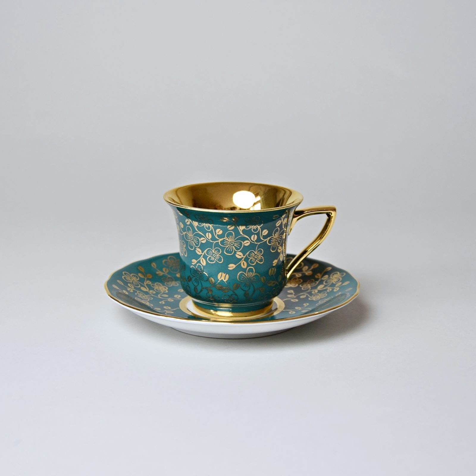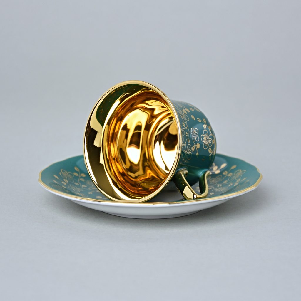 Roztomilý malý šálek 80 ml a podšálek Windsor, zlatá barva uvnitř - zelená barva + zlaté kytičky zvenku.