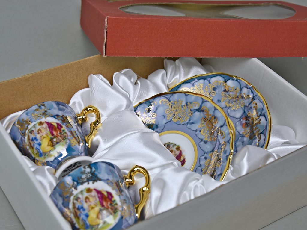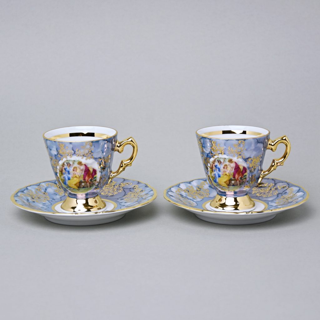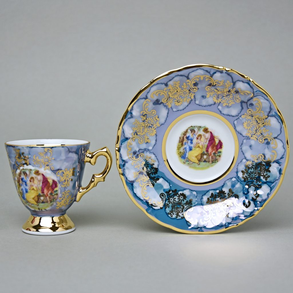 Šálek 80 ml mokka a podšálek 11,5 cm, 2 ks. + krabička, Tři Grácie, bledě modrý listr, Prince porcelain 1925