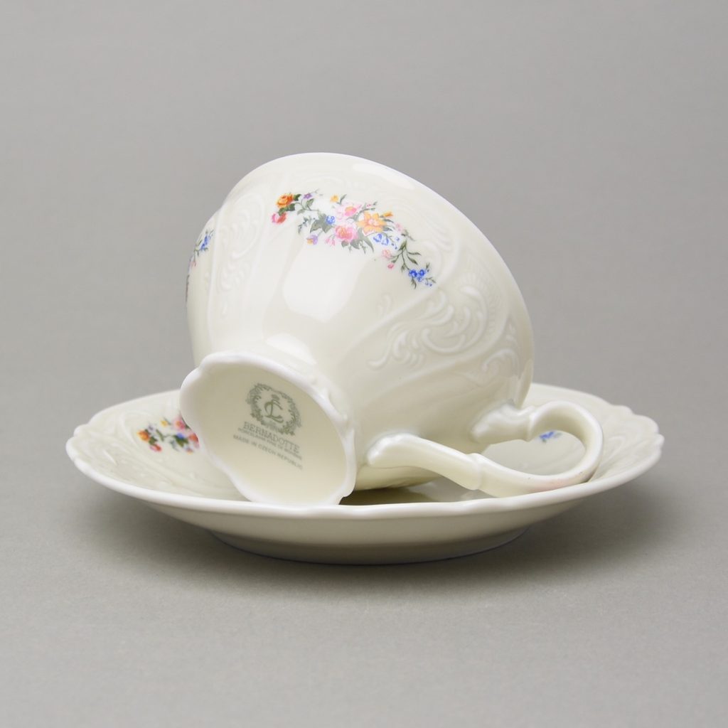 čajový nízký šálek tvaru Bernadotte s dekorem d00300 kytičky na slonové kosti, nové, dobře uchopitelné ouško, podšálek 155 mm