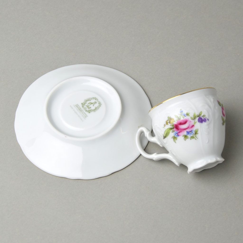 Na nejmenší šálek tvaru Bernadotte výrobce nedává spodní značku kvuli velikosti dna. Jen na podšálek. 167 g váha soupravy.
